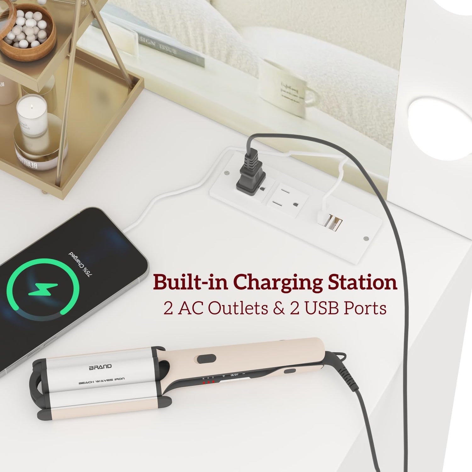 - Built-in Charging Station: Are you still worried about charging?Now this white vanity table is equipped with 2 AC power outlets and 2 USB ports to apply more charging choice for your phone, laptop and other electronic devices at the same time. Besides, it is very convenient to use hair dryer or hair curling iron in front of the large vanity mirror