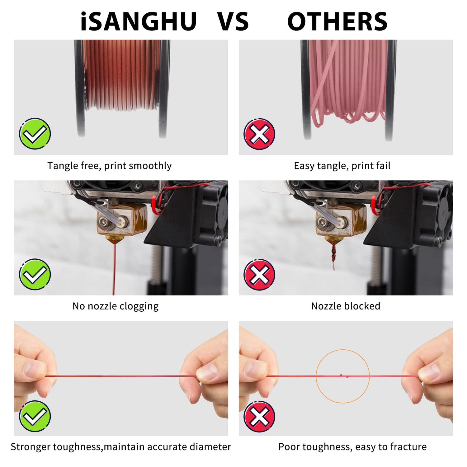 - [Toughness Enhanced & Rigidity]-iSANGHU PLA filament 1.75mm bundle is a dramatically improved fracture toughness enhanced PLA filament which has an excellent combination of toughness and rigidity, which can fully meet your needs for high tenacity functional parts printing projects