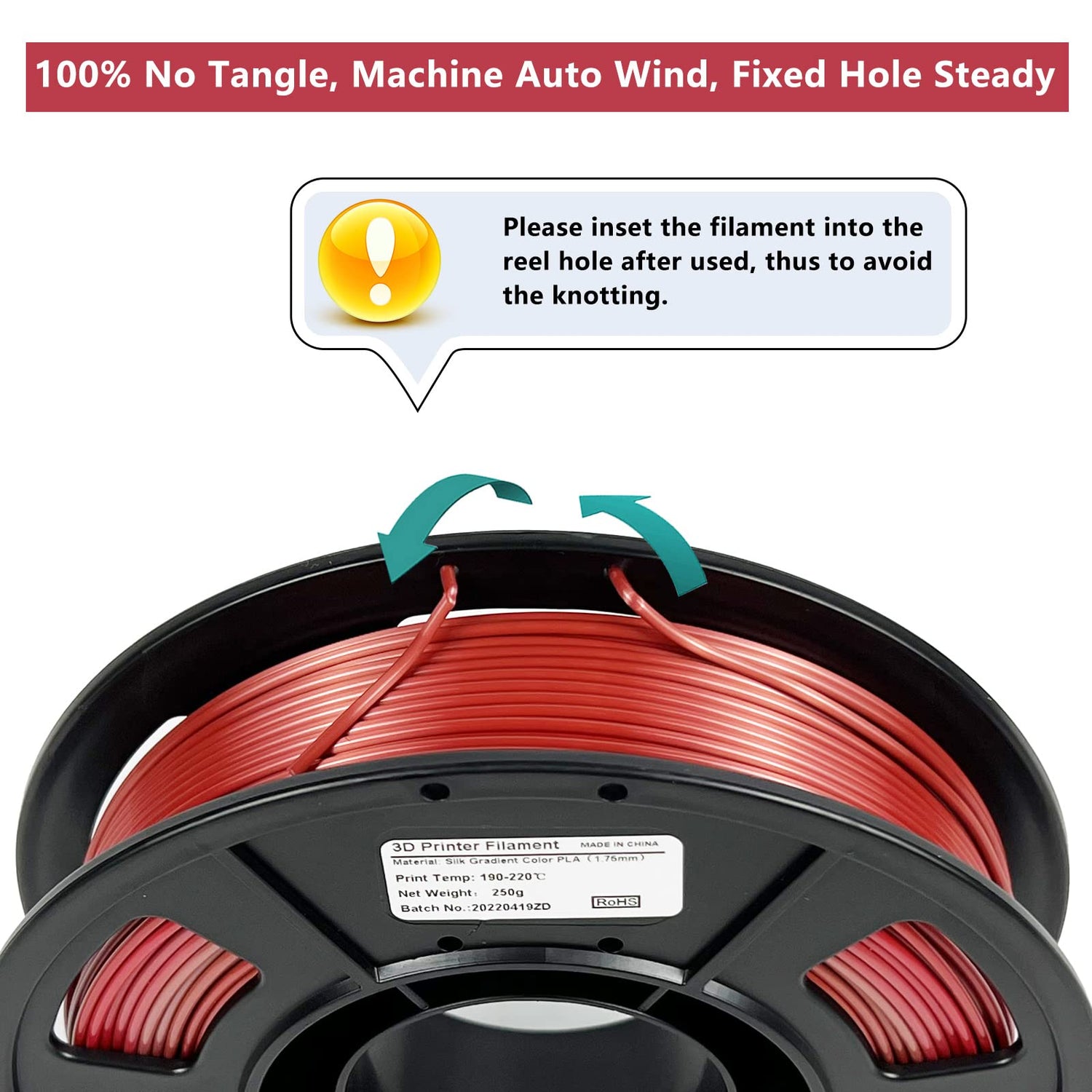 - [Clog-free & Bubble-Free]-color changing filament is Designed and Manufactured with Clog-Free technology which makes filament outflow smoother, and come out homogeneous. High-quality Shiny printing filament pla with a glossy appearance, good shaping, no bubble, no warping, and easy to print.