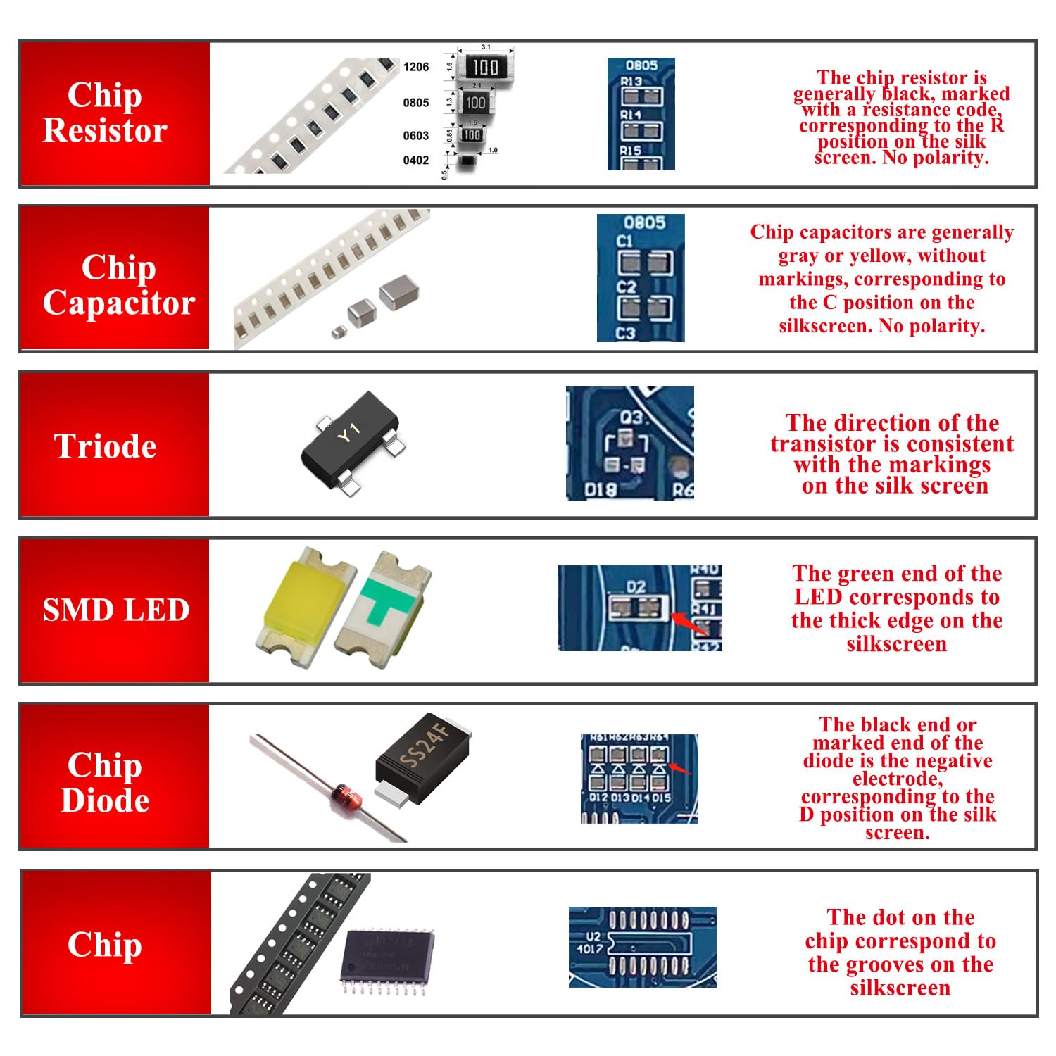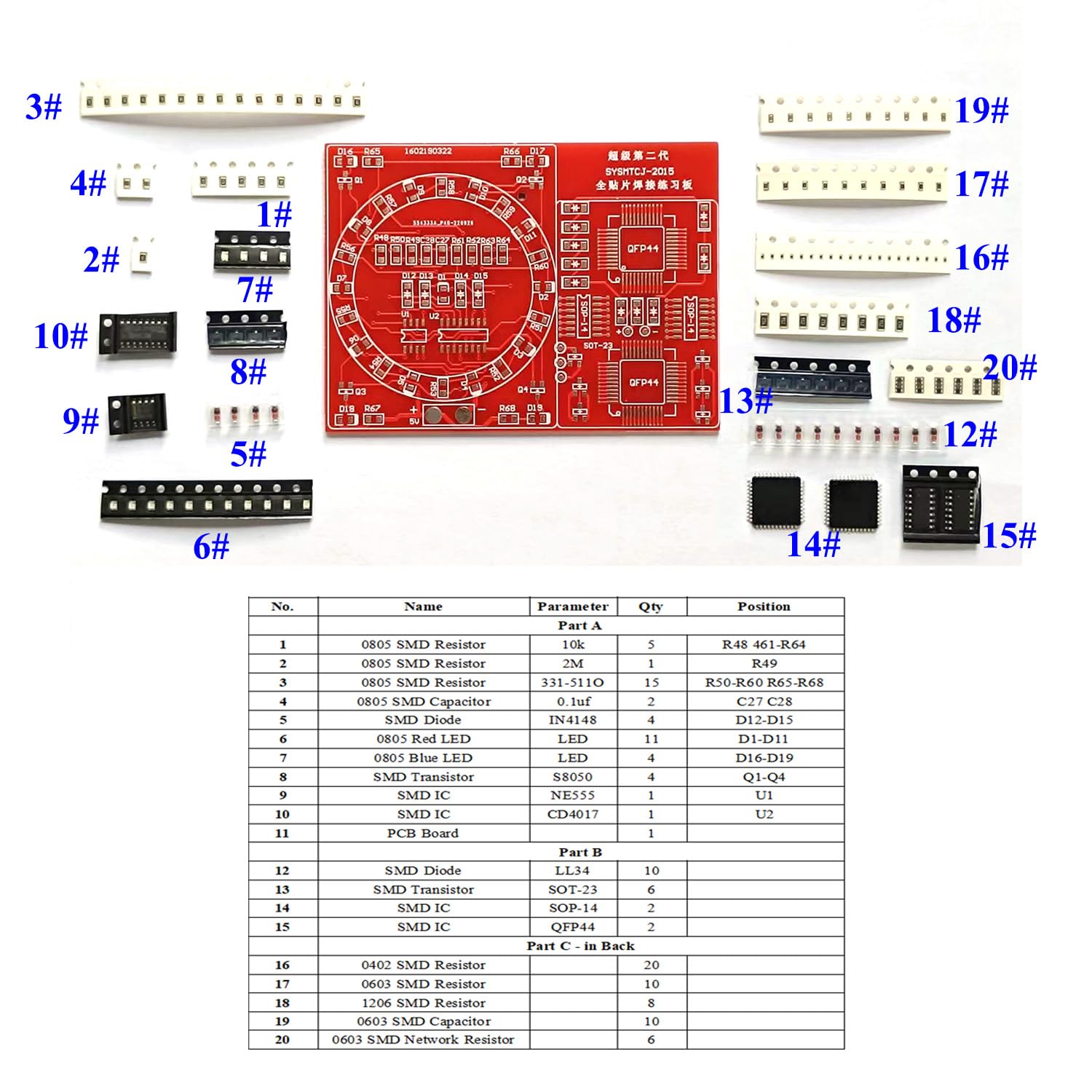 - 【SMD/SMT Components Soldering Practice Board】: Input voltage: DC5V. The positive pole is connected to +, and the negative pole is connected to -. After the SMD components are soldered, power on to form a running water lamp to detect the effect of the soldering.