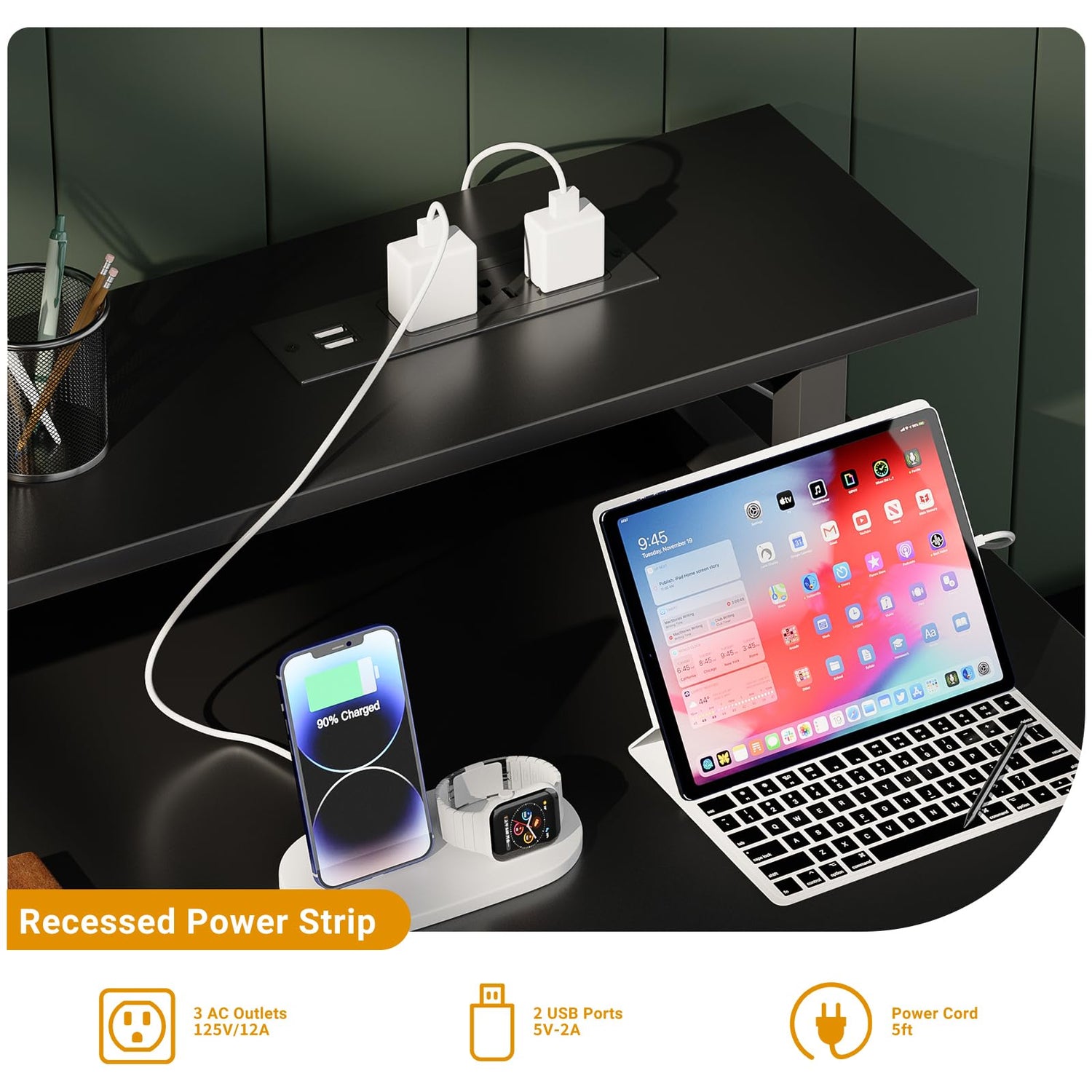 - 【Desk with Power Outlets & Monitor Stand】This computer desk is equipped with ith a built-in power strip with 3 Power outlets and 2 USB charging ports, which can easily charge phones laptops, gaming gear and other office devices. This desk with monitor stand can elevates your line of sight, allowing you to maintain proper sitting posture and protect your cervical and spinal health.