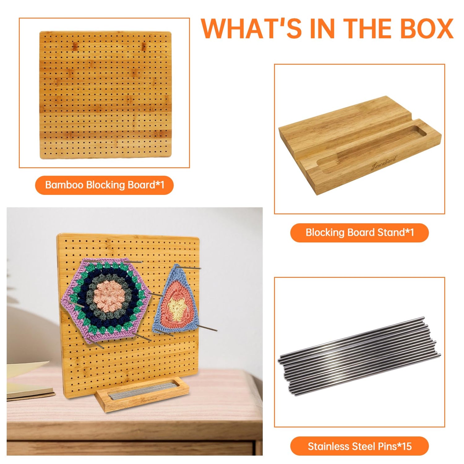 Iswabard 13x13 Inch Bamboo Crochet Blocking Board with 15 Stainless Steel Rods, Perfect for Beginners, Modern Style, Unisex, Adults