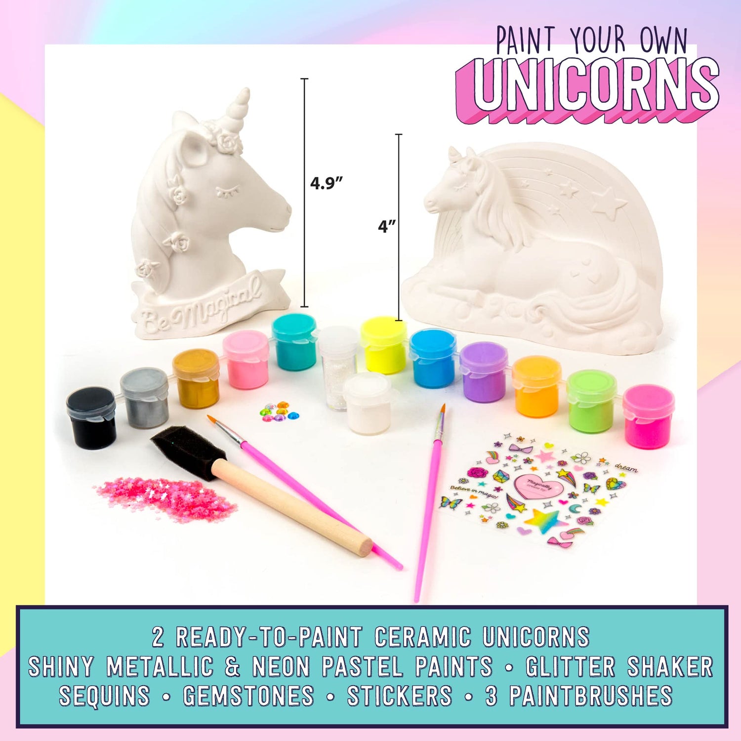 - KIT INCLUDES: 2 Ceramic Unicorns (5.875 in. x 2.2 in. x 4.875 in., 4 in. x 2.2 in. x 4.875 in.), 2 Paintbrushes, 1 Iridescent Glitter Shaker (3g), 1 Bag Iridescent Sequins (2.5g), 1 Sponge Brush, 1 Acrylic Neon Pastel 6-Color Paint Strip (5mL each), 1 Acrylic Metallic 5-Color Paint Strip (5 mL each), 1 Sticker Sheet, 7 Colorful Gemstones, 1 Glue Tube, Easy-to-Follow Instructions