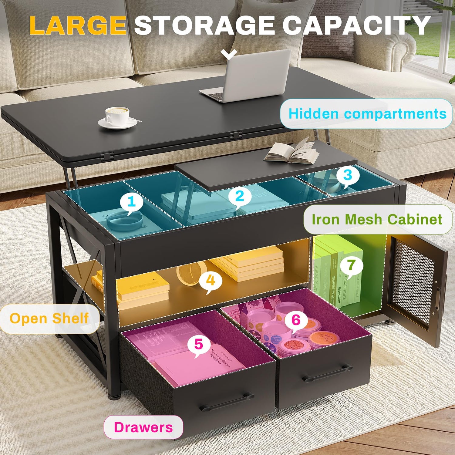 - 【What you get?】The lift top coffee table with 4 lifting methods also has a partitioned hidden storage compartment, an open storage shelf, 2 fabric drawers, a storage cabinet, and an LED light. Coffee tables for living room can be used when eating, working, studying, and playing games, quietly and easily lift the table top to facilitate a small room to make full use of the space. (Caution: Lower table top must be raised first to avoid damage. )
