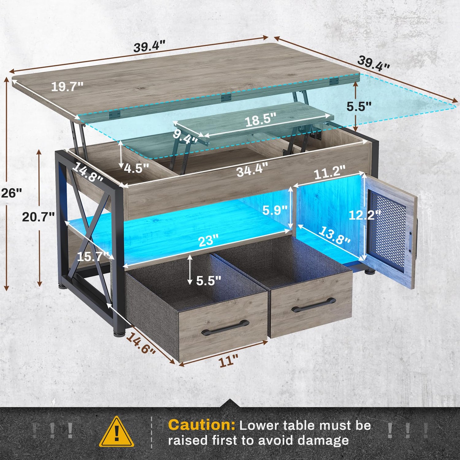 - 【What you get?】The lift top coffee table with 4 lifting methods also has a partitioned hidden storage compartment, an open storage shelf, 2 fabric drawers, a storage cabinet, and an LED light. Coffee tables for living room can be used when eating, working, studying, and playing games, quietly and easily lift the table top to facilitate a small room to make full use of the space.(Caution: Lower table top must be raised first to avoid damage. )