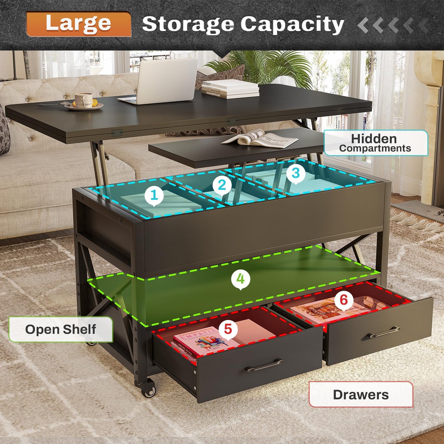 - 【What you get?】The lift top coffee table with 4 lifting methods also has partitioned hidden storage compartment, an open storage shelf, 2 drawers and LED light. A small coffee table for living room can be used when eating, working, studying and playing games, quietly and easily lift the table top to facilitate small room to make full use of the space.(Caution: Lower table top must be raised first to avoid damage. )