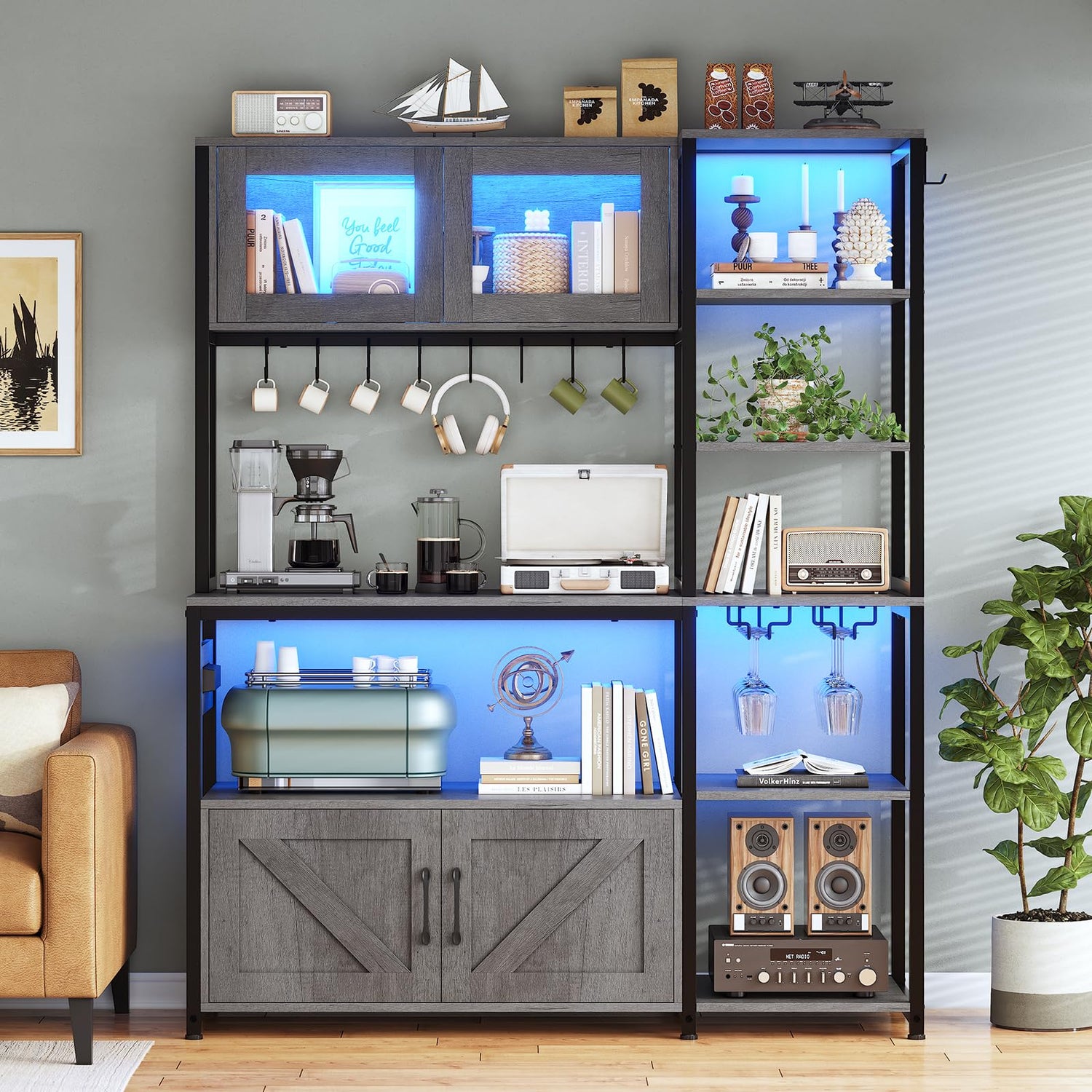 Itaar 45.3 Inch Farmhouse Bakers Rack with Power Outlet, LED Light and Storage Solutions in Grey