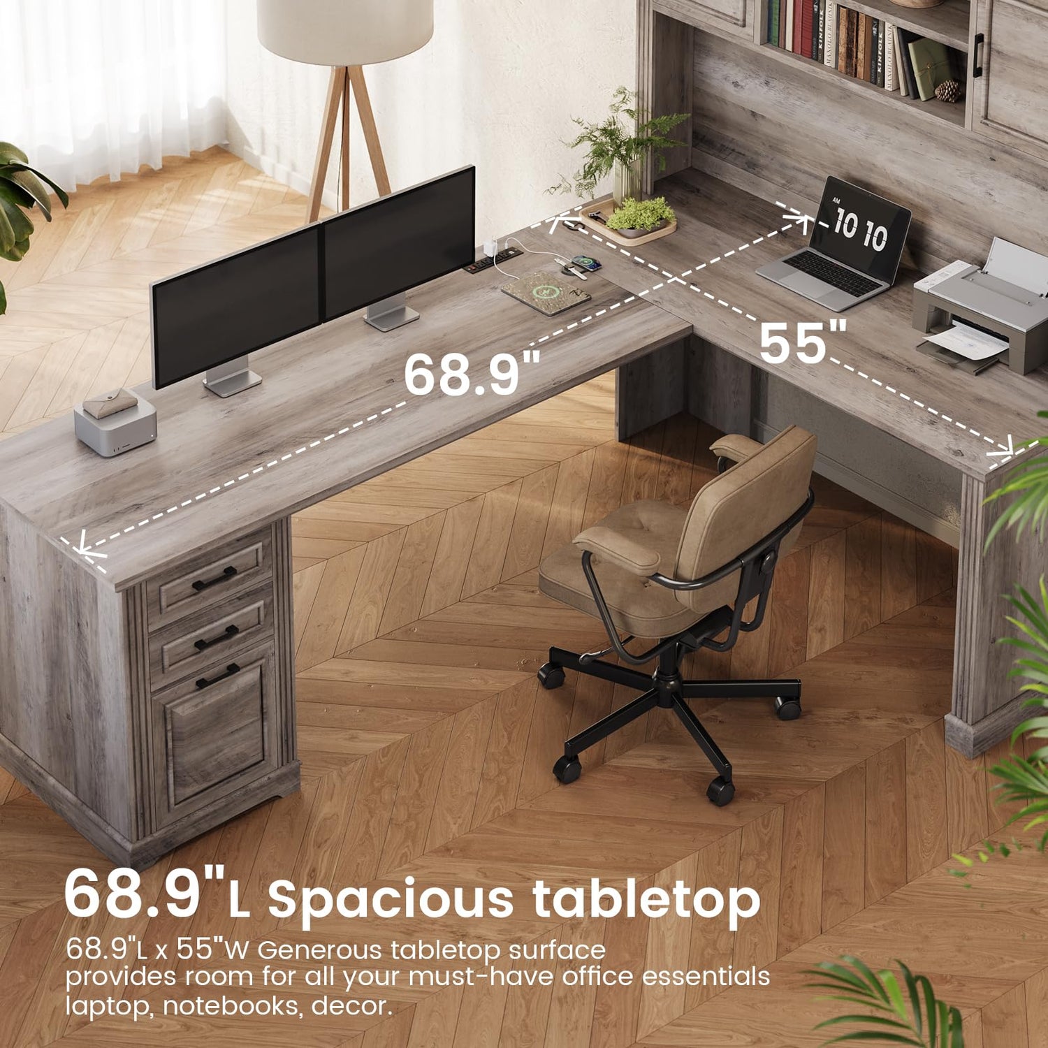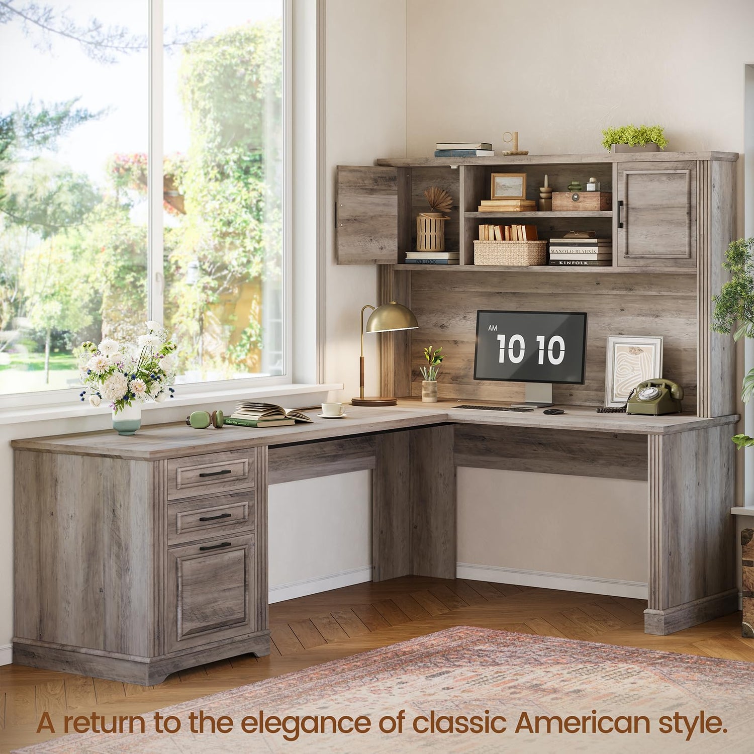 Itaar Farmhouse Executive L Shaped Desk, Home Office Desk with File Drawer and Power Outlet, Computer Corner Desk with Hutch and Drawer, Workstation for Office Home, Grey