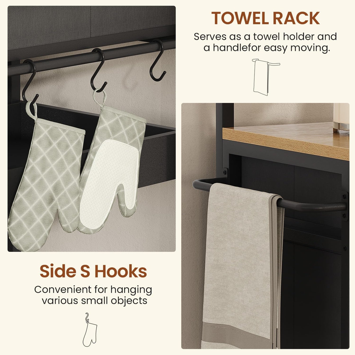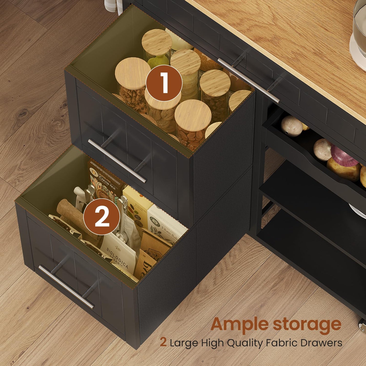 - 【Plenty of storage space】This kitchen island cart comes with 2 high shelves, 8 S-hooks, and side handles - perfect for hanging cups, spice jars, towels, etc.It has 3 big fabric drawers to store kitchen essentials like spices, snacks, coffee, or cutlery.Plus, there are 3 side shelves for your kitchen appliances.
