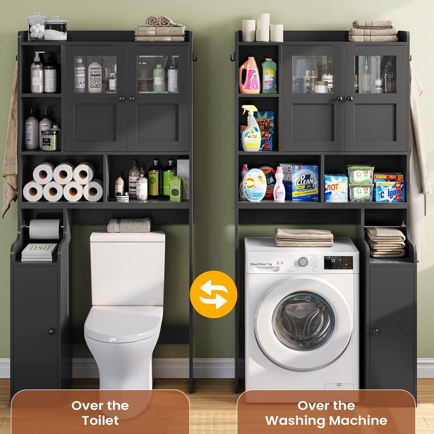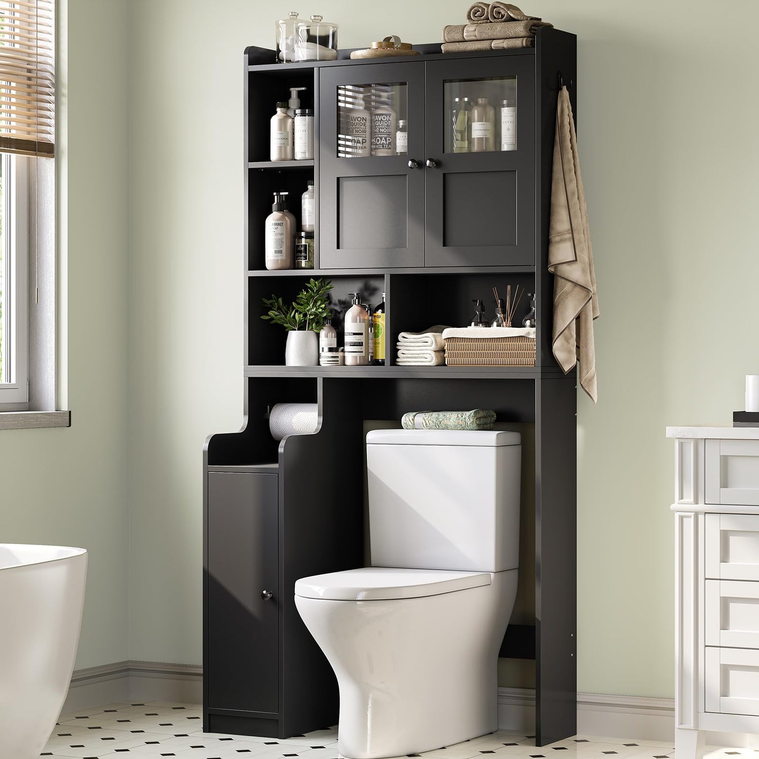Itaar Over The Toilet Storage Cabinet, Over Toilet Bathroom Organizer with Glass Doors & Toilet Paper Holder Stand, Home Space-Saving Toilet Rack, for Bathroom, Restroom, Laundry(Black)