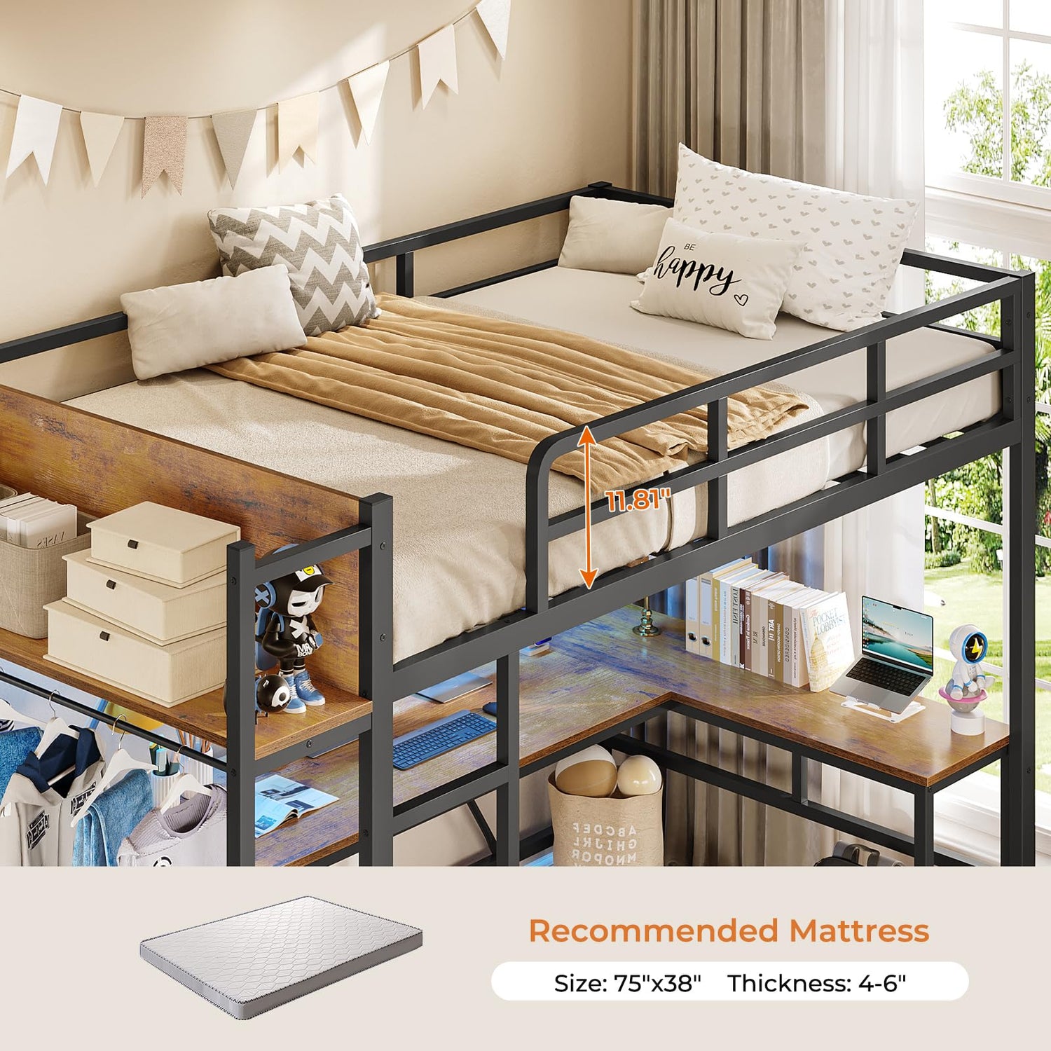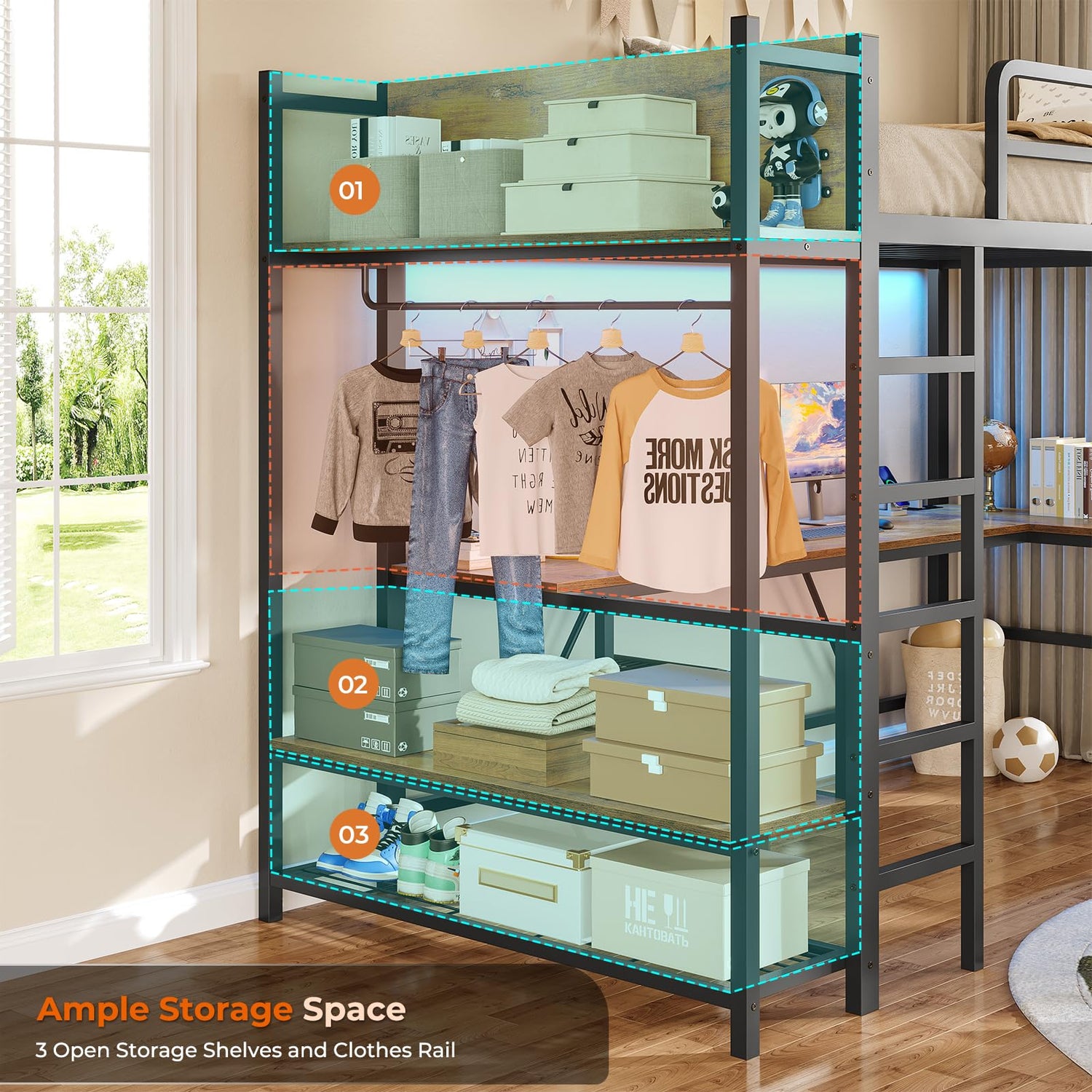Itaar Twin Loft Bed with L-Shaped Desk, LED Lights and Charging Sation, Loft Bed Twin Size with 3-Tier Storage Shelves and Clothes Rail, Safety Guard & Ladder, No Box Spring Needed, Rustic Brown