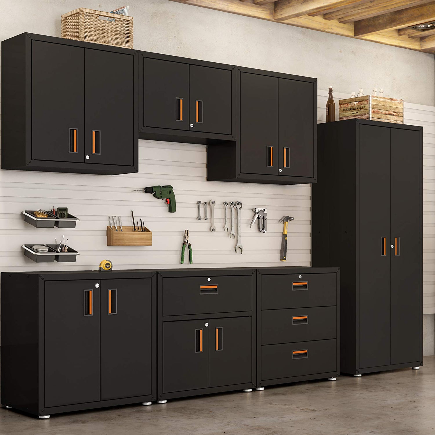 - SPATIAL EFFICIENCY REDEFINED: With this garage storage cabinet, turn any wall into a storage masterpiece. Designed to save floor space, our outdoor wall cabinet makes organization a breeze. Including a removable shelf facilitates custom arrangements, allowing it to serve as an upper cabinet that neatly tucks away various items – from automotive supplies to gardening tools.