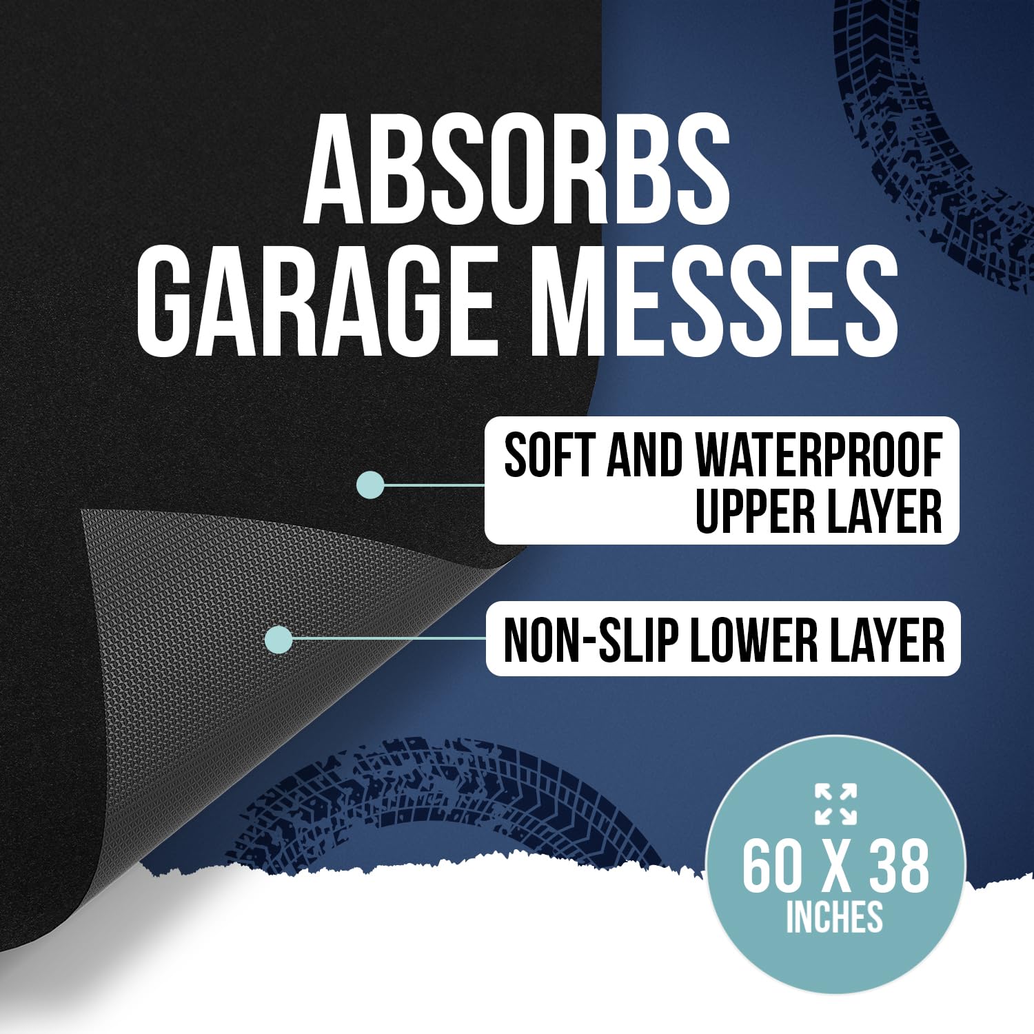 - CONTAINS AND PROTECTS: Our mat absorbs and contains liquids like oils, transmission fluid and more to protects your garage floor from permanent staining. A moisture wicking fabric and waterproof and nonslip second layer will help you work with security and peace of mind.