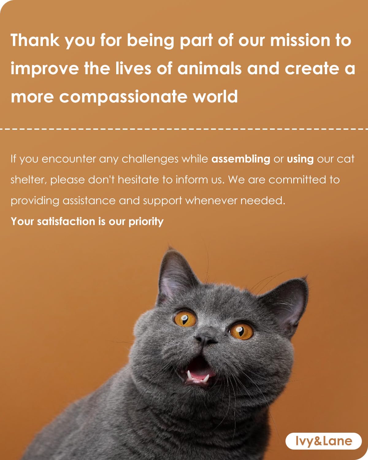• 😽【Indoor/Outdoor Cat House】 The Ivy & Lane Cat Shelter House is an intricately designed sanctuary, crafted to ensure the utmost comfort and safety for our cherished feline friends. It is built using a blend of durable materials: 6-sided foam insulation encased by plywood on the interior, and robust fir wood on the exterior