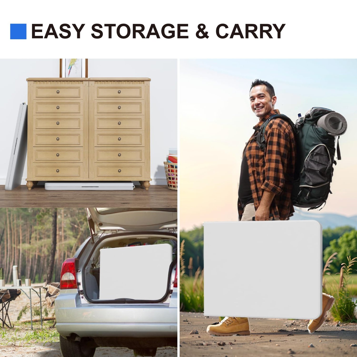 - Portable & Folding Design: The security lock allows this white folding table to be tightly locked and easily stored in small spaces such as the bottom of the cabinet, car trunk and other spaces. The foldable table with carry handle makes transport conveniently