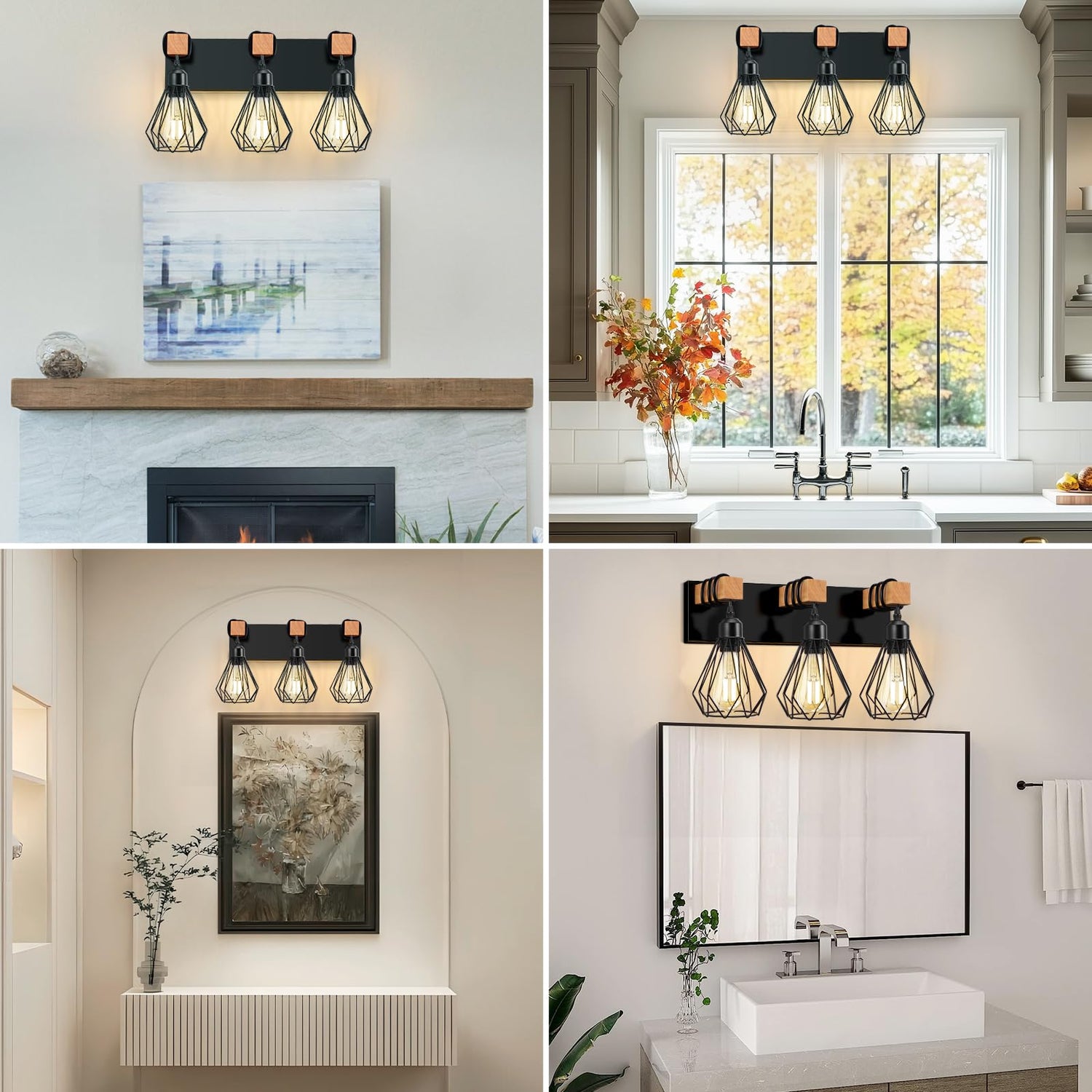 - 【Farmhouse Bathroom Light Fixtures】Rustic wood and black metal cage infuse farmhouse charm, with light filtering through the matte black cage to cast an antique rustic glow. Light and shadow play adds visual interest, effortlessly blending style and ambiance in your bathroom