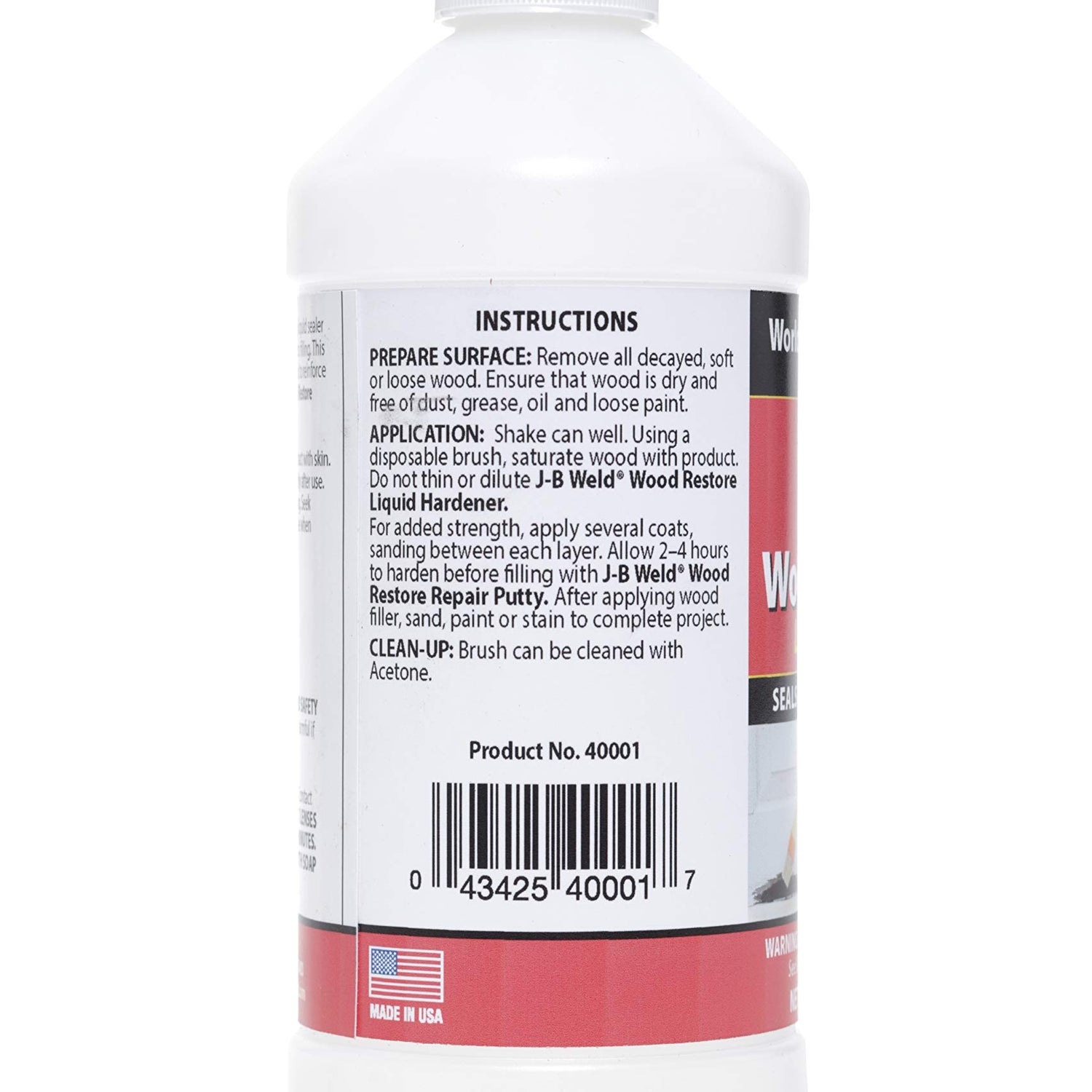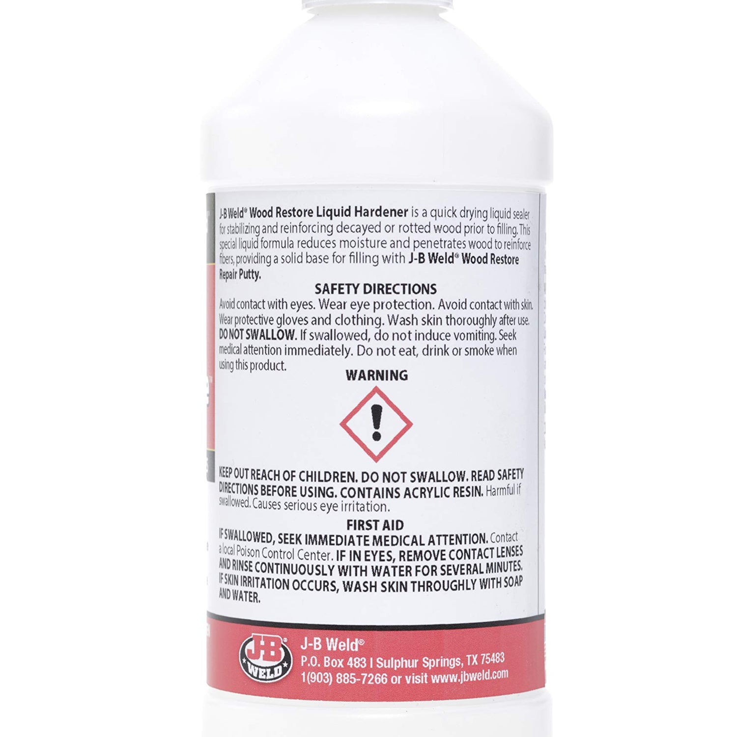 Details: J-B Wood Restore Liquid Hardener is a quick drying liquid for sealing and reinforcing decayed or rotted wood; for reducing moisture in decaying or rotted wood surfaces, prior to putty filling. The special liquid formula penetrates the wood to reinforce the fibers stopping further decay and providing a solid base for J-B Wood Filler Compound.