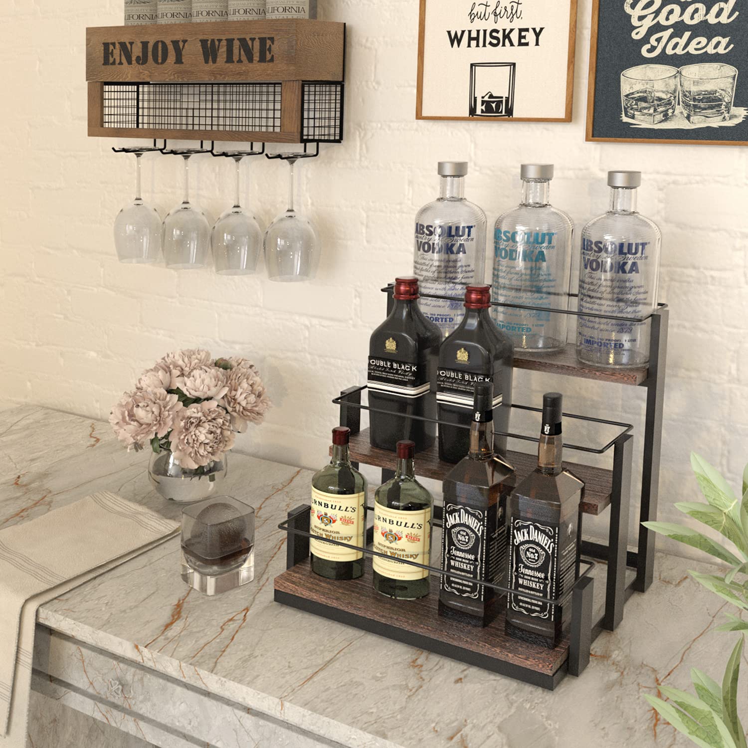 - [HIGH QUALITY]- Made of high quality torched color paulownia wood base and anti rust black metal frame, which helps sturdily support all your glass and plastic bottles in place without falling. Minimal assembly required with the included hardware and instructions