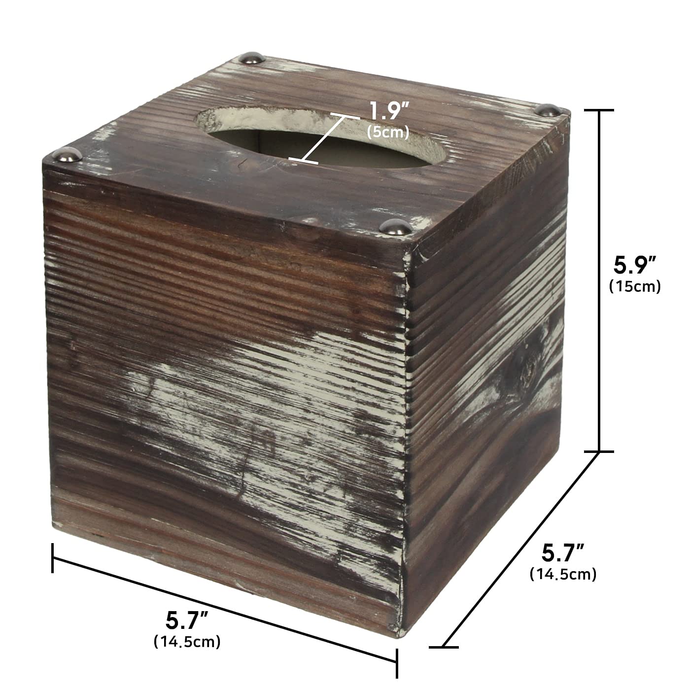 - [Dimensions for Standard size] - Vintage Rustic Wood Tissue Holder measures 5.7" in length, 5.7" in width and 5.65" in height (inches). It fits most standard square tissue boxes or smaller ones, but not work for rectangular tissue boxes.