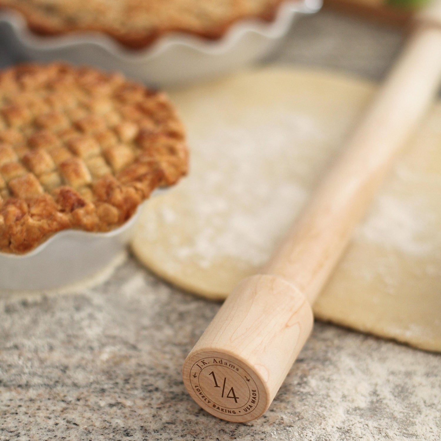 Details: J.K. Adams has created this new Lovely line of premium rolling pin in collaboration with professional bakers Bob and Gina Harwig from Lovely, a bakeshop in Chicago. The innovative design insures that your dough is rolled to the perfect thickness every time. Our two professional 24” pins deliver a dough thickness of 1/8-inch or 1/4-inch, while our 18-inch pin provides a thickness of 1/4-inch. This maple rolling pin is just one in a complete serious of pins available from J.K. Adams. Wipe surface clean with a damp cloth as needed. Manufacturer’s 5-year warranty. J.K. Adams Company has created American made wooden cutting boards, wine racks, knife racks and knife storage since 1944. J.K. Adams continues their New England craftsmanship with wooden salad bowls, kitchen islands and slate serving trays. J.K. Adams Company – Kitchenware for Life.