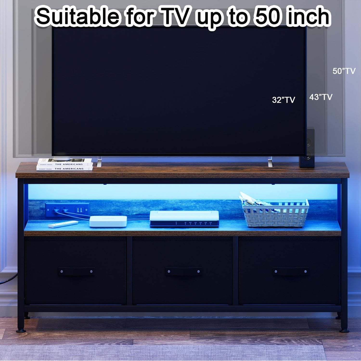 J-yaamiZz 39" TV Stand for TVs up to 50", Media Console with Charging Station & LED Lights, 2 Drawer Storage Chest, Gaming Entertainment Center with Storage for Living Room, Brown, Medium