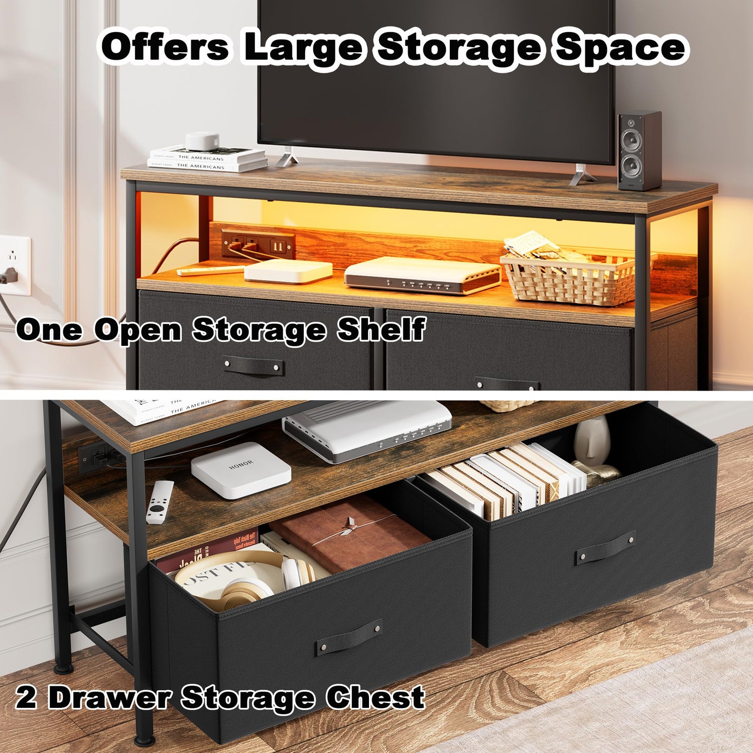 - Spacious Open Storage: With a spacious tabletop and one open storage shelf offering Large open storage space for DVDs, sound bars, remotes, magazines, lamps, books, or whatever you like, this TV Console keeps your bedroom and living room organized.