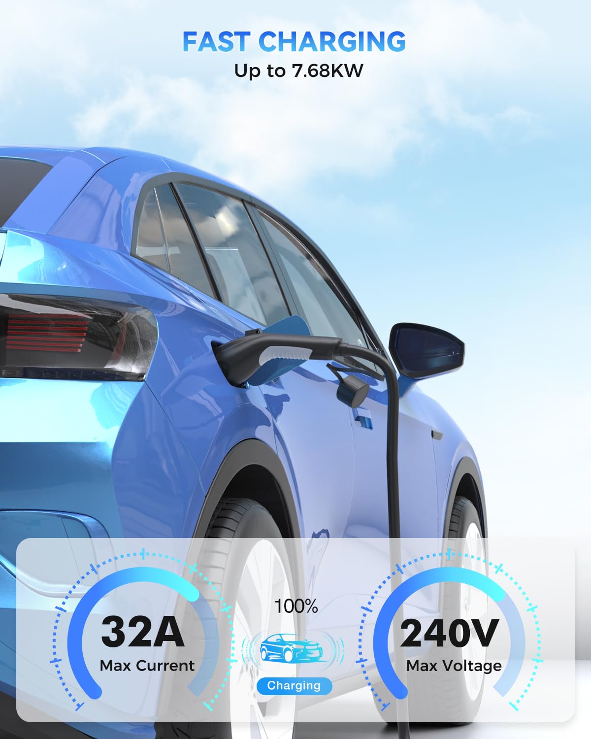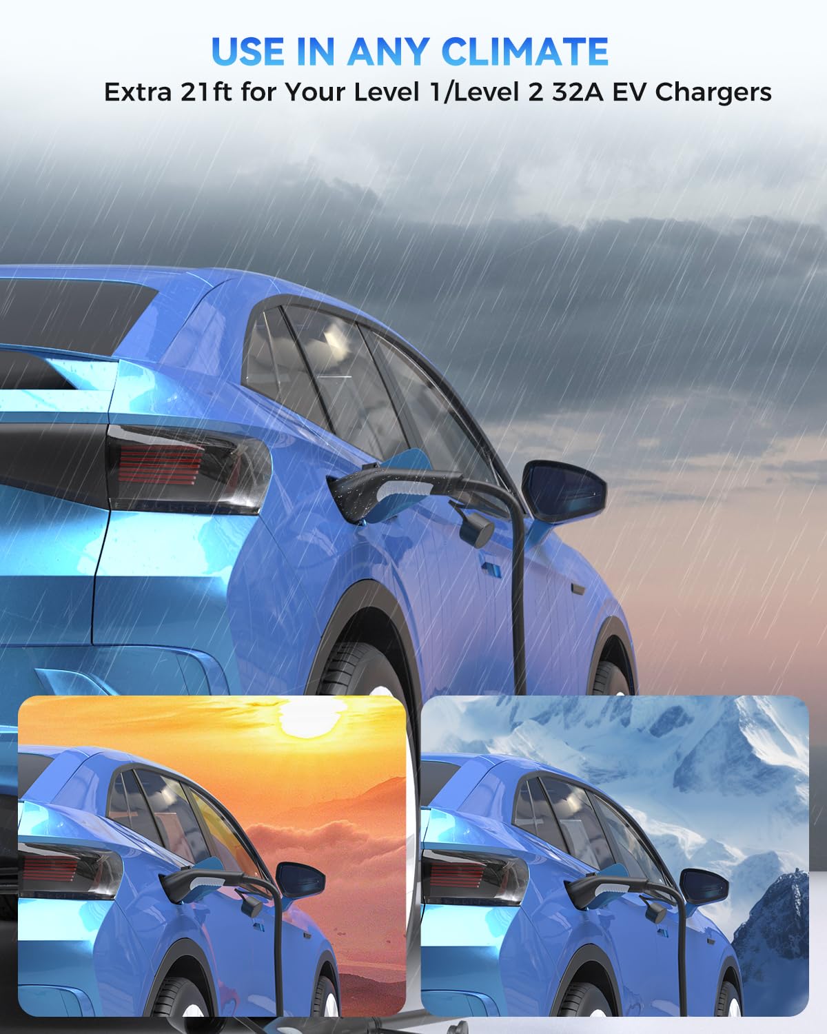 - 【Up to 32Amp Amperage Support】This ev extension cord is compatible with BEVs/PHEVs that come with J1772 charging port, supports a maximum amperage of 32Amp 250V AC, ensuring fast and efficient charging. No power loss. This means that you can charge your EV quickly and efficiently, getting you back on the road in no time.