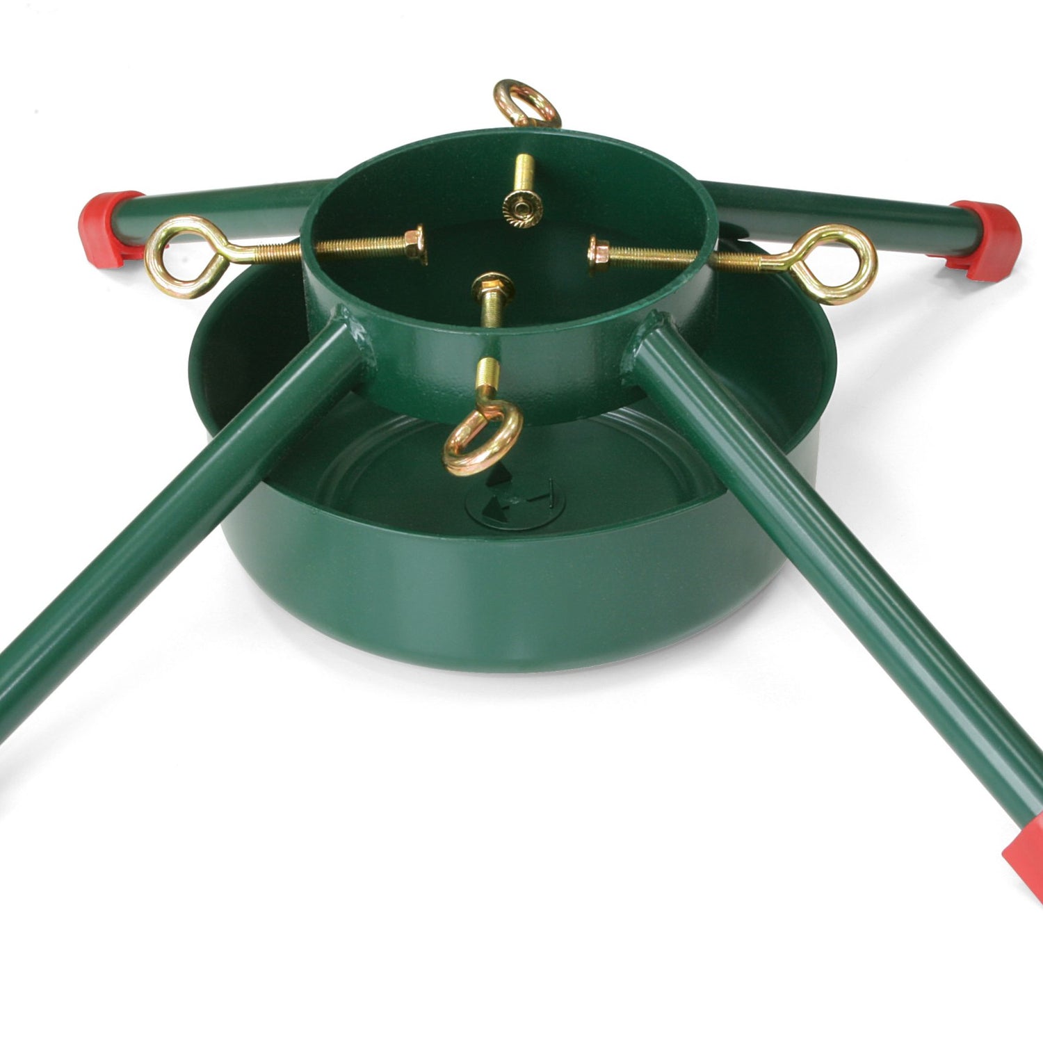 - 4 eye-bolts hold tree trunk securely. Steel spike base for stability. Tubular steel legs will not flex under the load of heavy trees. Corrosion-resistant 'gold tone' zinc-dichromate hardware.