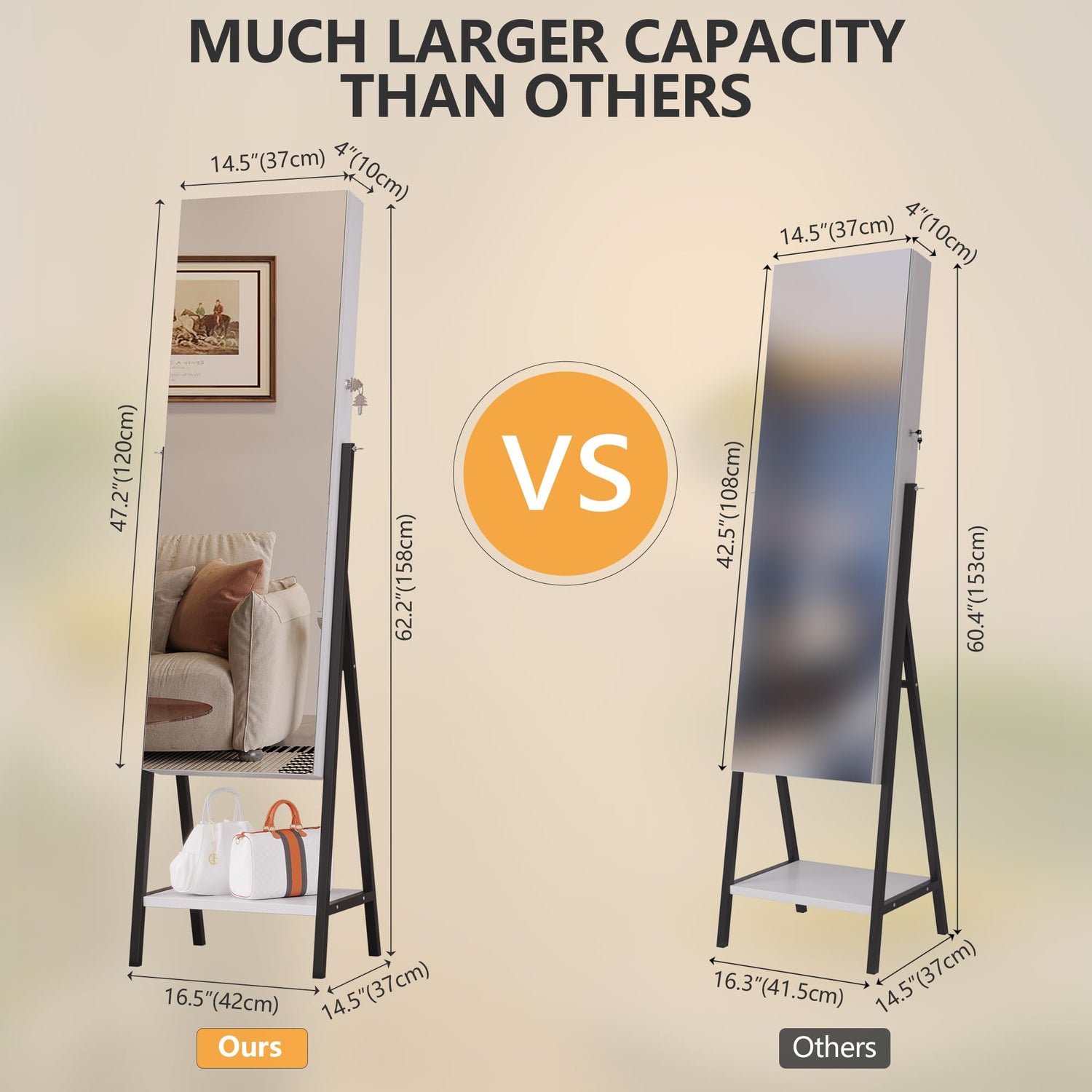 - [47.2” H Ample Storage Capacity] Product dimensions: 14.5"D x 16.5" W x 62.2"H, and 47.2"H x 14.5"W x 4"D Storage space larger than other standing jewelry armoires (42.5” H Mirror), a solution for organizing earrings, necklaces, rings, bracelets, makeup tools, get organized and say goodbye to clutter