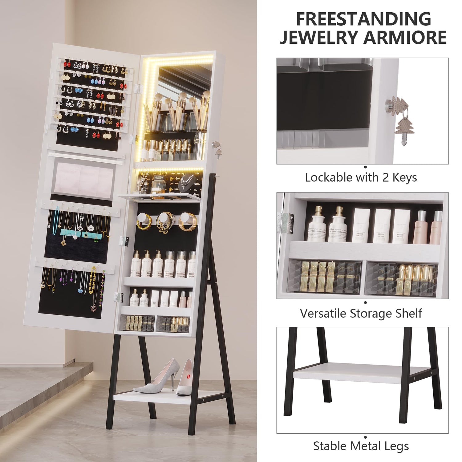 jajov 47.2" LED Jewelry Cabinet Armoire, Standing Mirror with Jewelry Storage, Jewelry Organizer Armoire with Full Length Mirror, Lockable Jewelry Mirror Cabinet (White)