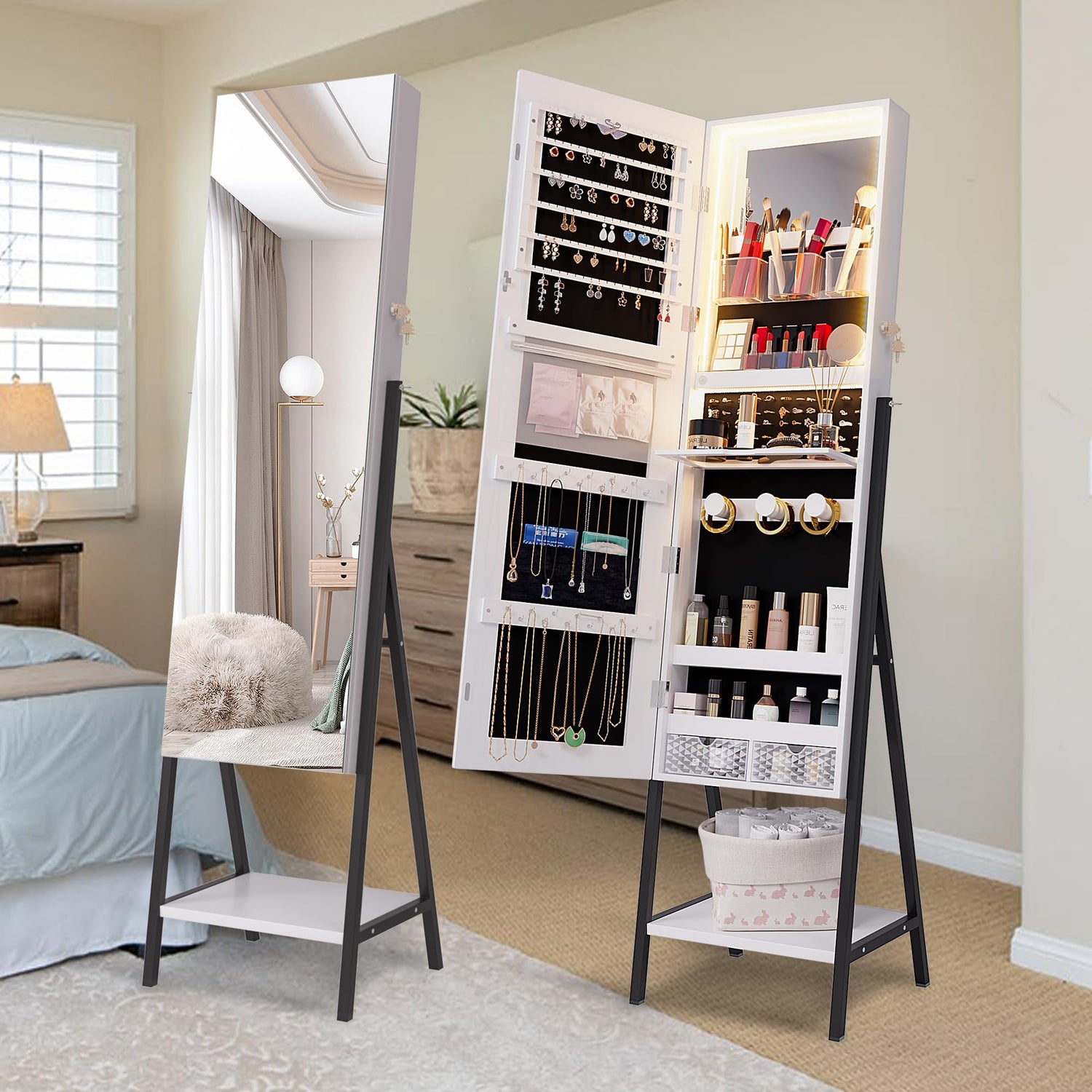 - [Standing Full-Length Mirror Design] A full-length mirror with jewelry storage measuring 47.2"H x 14.5"W X 4"D, giving you a head-to-toe view. All you need for fitting and make-up is a standing mirror jewelry cabinet, and the standing design allows you to move it wherever you want