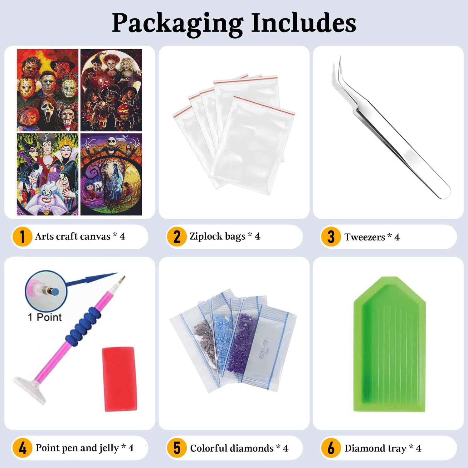 - 【Diamond Painting Kits】 Diamond painting accessories and tools comes with everything you need! Including 4x waterproof painting canvas, 4xtrays, 4x wax, 4x point diamond pen, 4x tweezers, self-sealing bags and enough diamond art beads. For each diamond art kit we'll provide 30% more diamond beads than needed.
