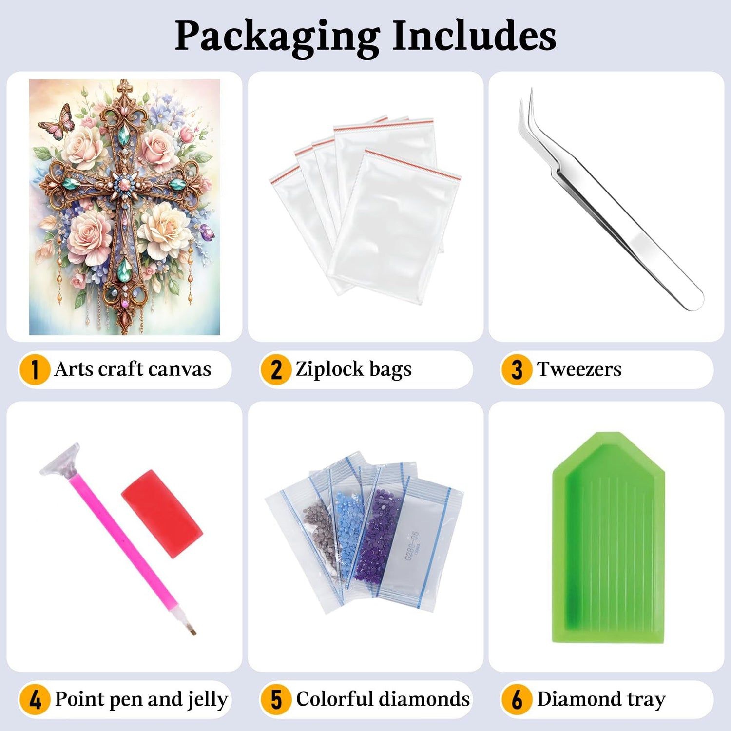 - 【Diamond Painting Kits】 Diamond painting accessories and tools comes with everything you need! Including 1x waterproof painting canvas, 1xtrays, 1x wax, 1x point diamond pen, 1x tweezers, self-sealing bags and enough diamond art beads. For each diamond art kit we'll provide 30% more diamond beads than needed.