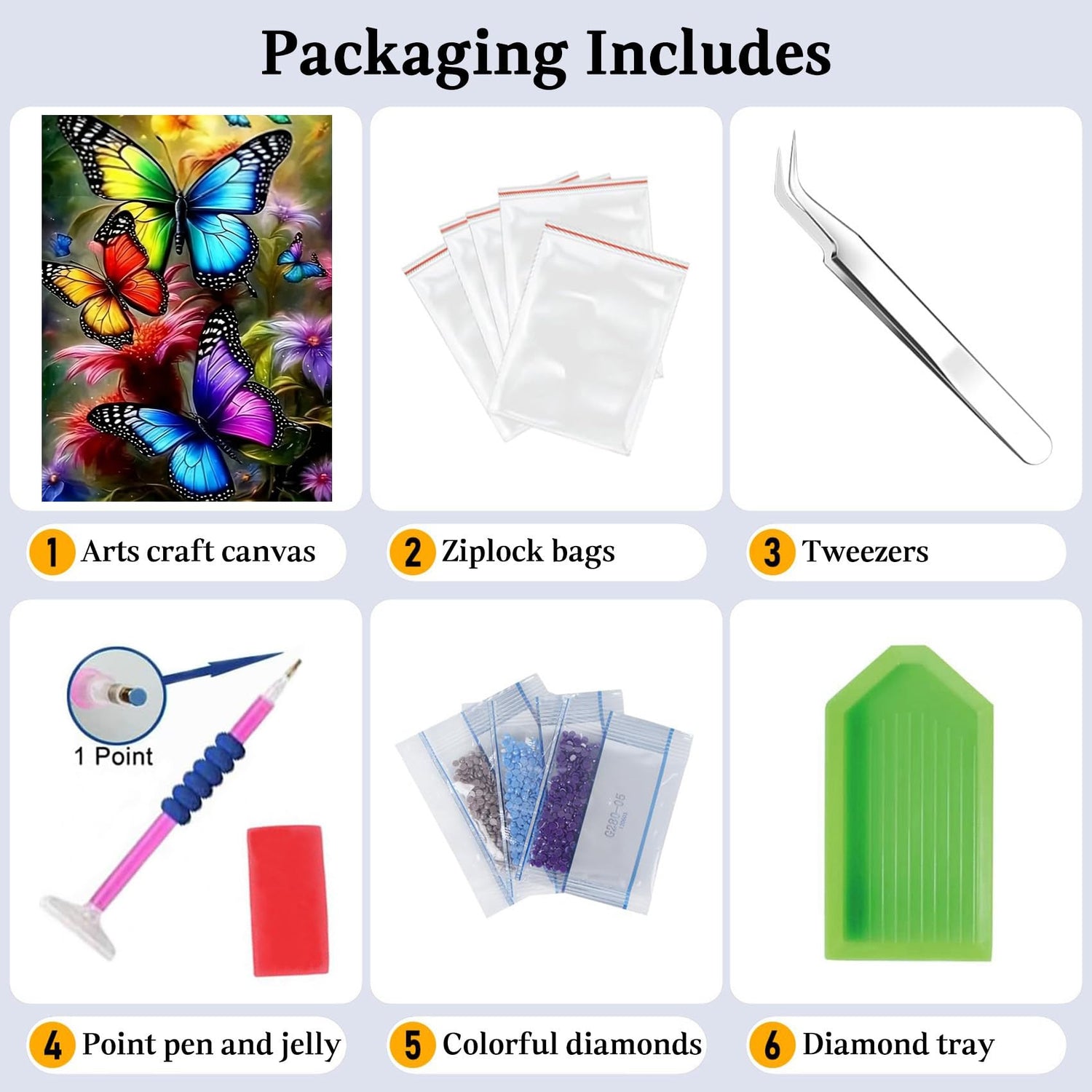 - 【Diamond Painting Kits】 Diamond painting accessories and tools comes with everything you need! Including 1x waterproof painting canvas, 1xtrays, 1x wax, 1x point diamond pen, 1x tweezers, self-sealing bags and enough diamond art beads. For each diamond art kit we'll provide 30% more diamond beads than needed.