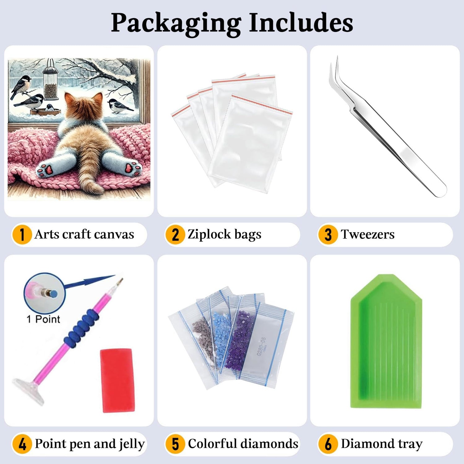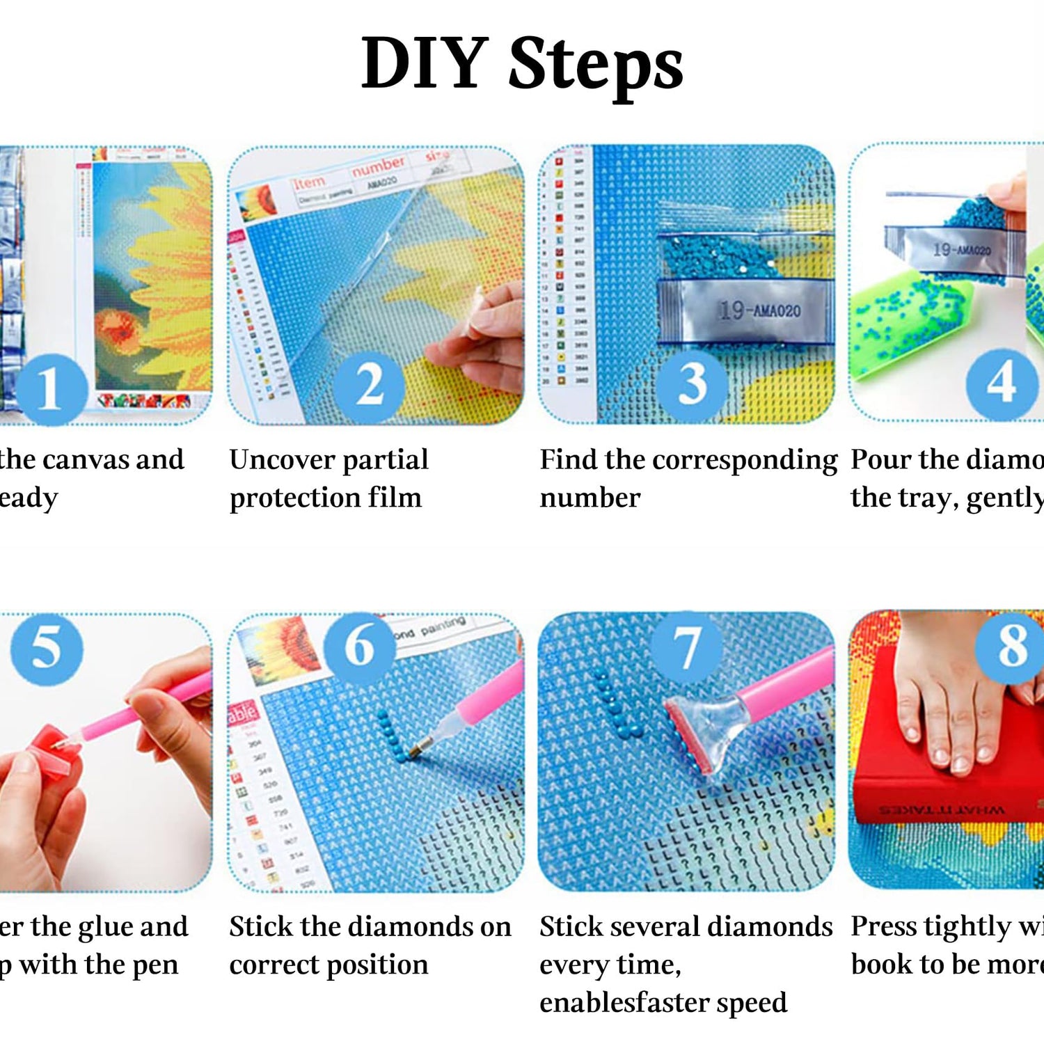 - 【Diamond Painting Kits】 Diamond painting accessories and tools comes with everything you need! Including 1x waterproof painting canvas, 1xtrays, 1x wax, 1x point diamond pen, 1x tweezers, self-sealing bags and enough diamond art beads. For each diamond art kit we'll provide 30% more diamond beads than needed.