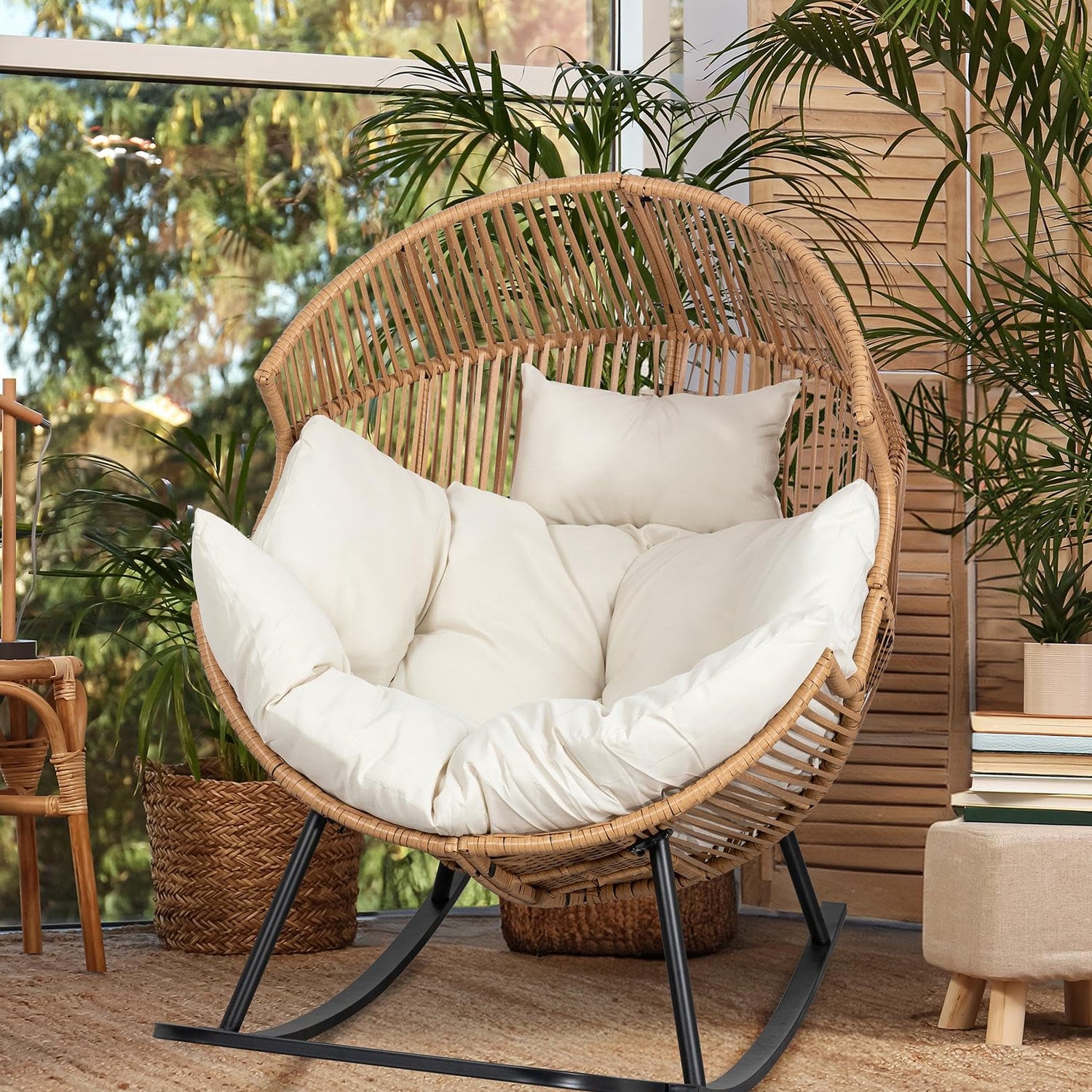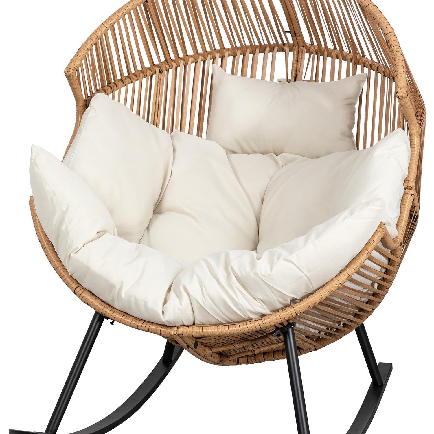 JAMFLY Egg Chair Outdoor Rocking Chairs, Wicker Patio Chair Oversized Lounger Chair with Cushion for Indoor Living Room Bedroom Outside Patio Backyard Balcony, Beige