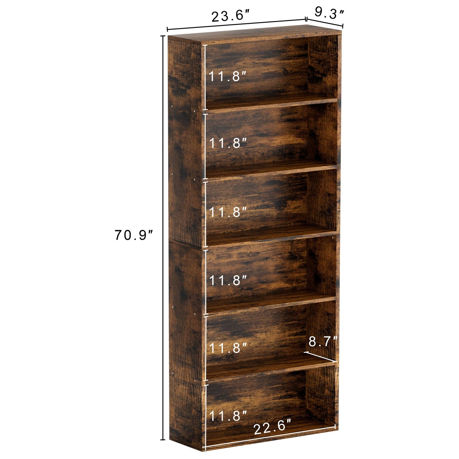 - 6 Tier Bookshelf: This 6-tier bookshelf sized 9.3”D x 23.6”W x 70.9”H,the simple upright and open design of tall bookshelves can help you save more space in your house. This bookshelf can be used as a storage organizer and display stand
