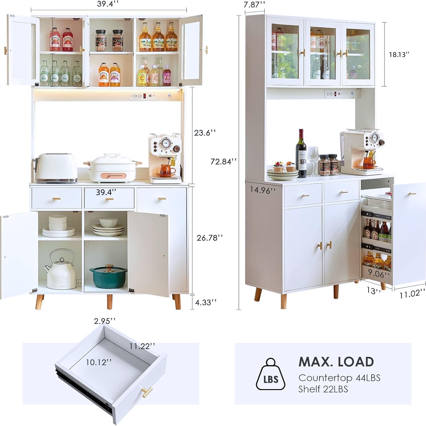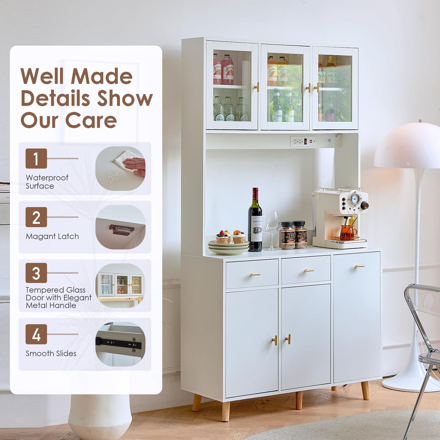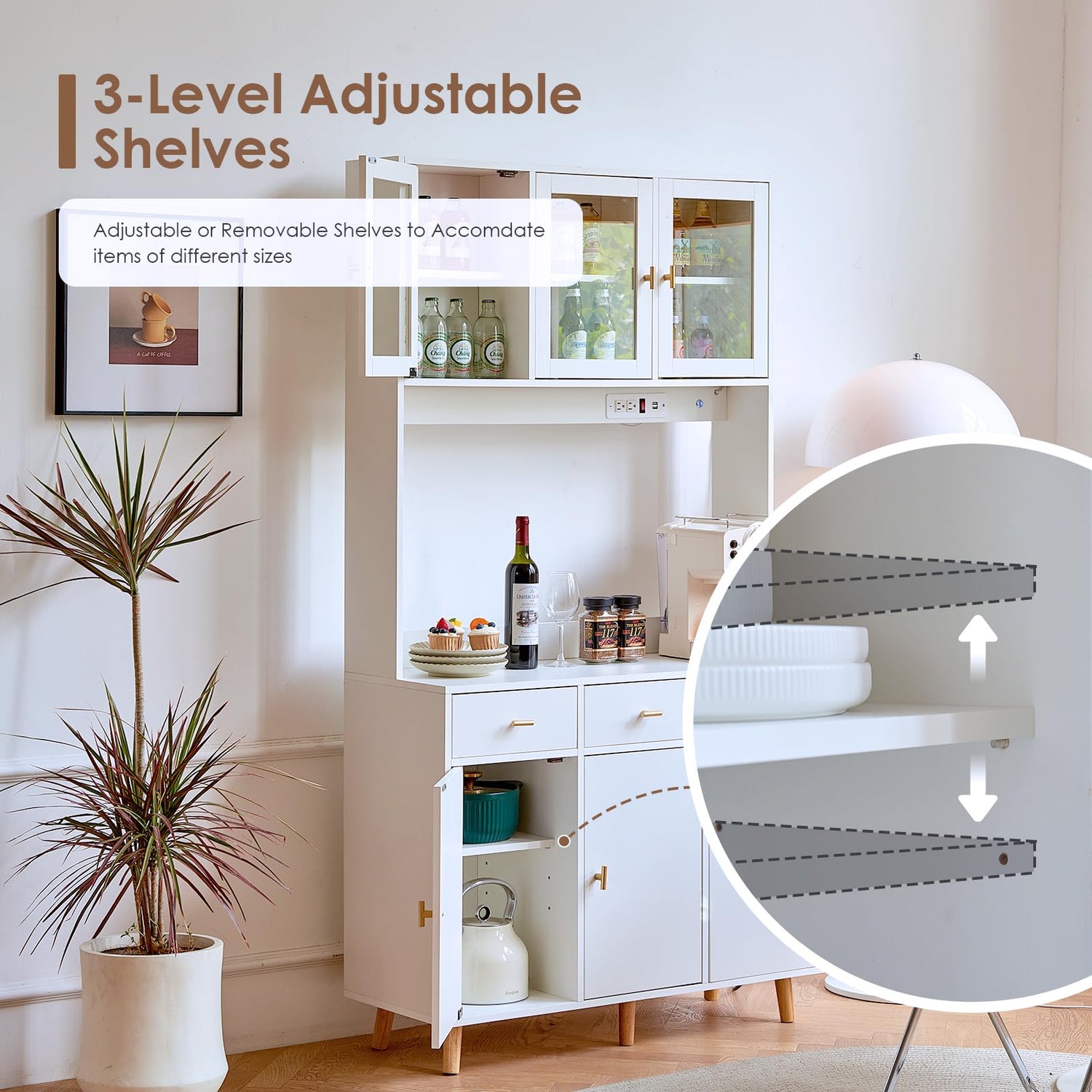 - 🌟【Kitchen Pantry Cabinet with Built-in Outlet】:The kitchen hutch cabinet built-in power strip with 2 outlets and 2 USB ports for added convenience, which help you easily charge the coffee maker, bar accessories, lamp and other electrical appliances.