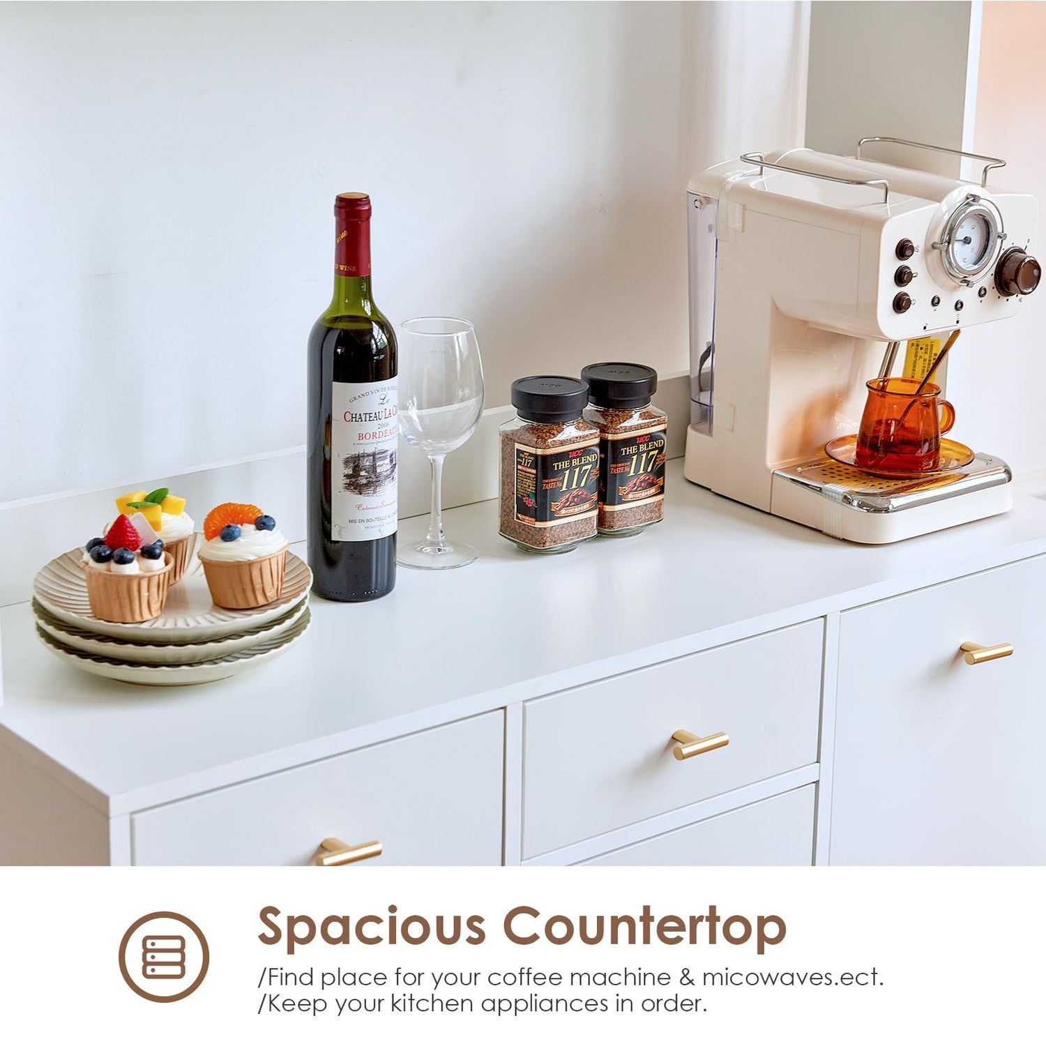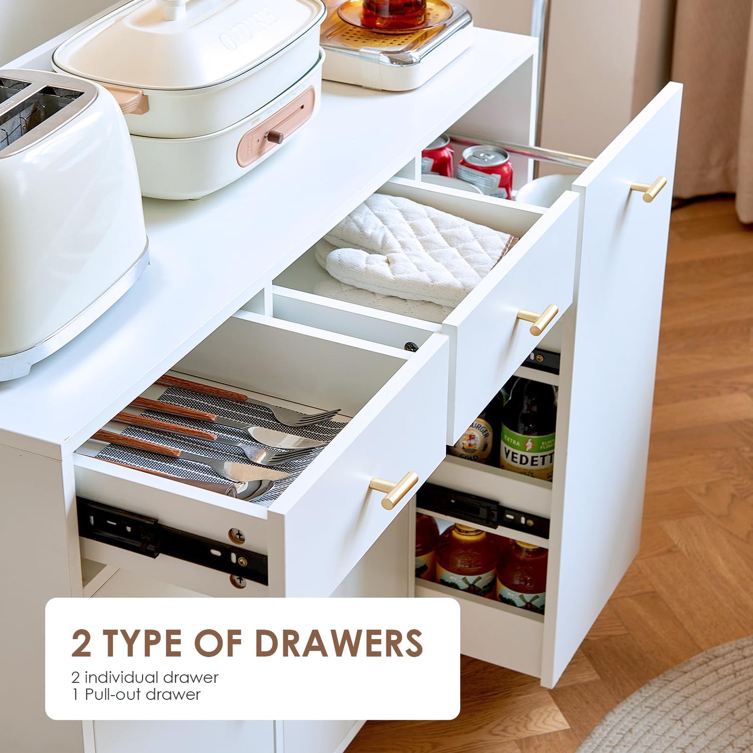 - 🌟【Larger Storage Space】: Featuring ample compartments, 3 glass doors, 2 large cupboard with adjustable shelf, 1 open storage countertop and 3 easy-glide drawers, this large freestanding kitchen hutch provides both open areas and hidden spaces to keep all your kitchen appliances and cooking accessories well organized.