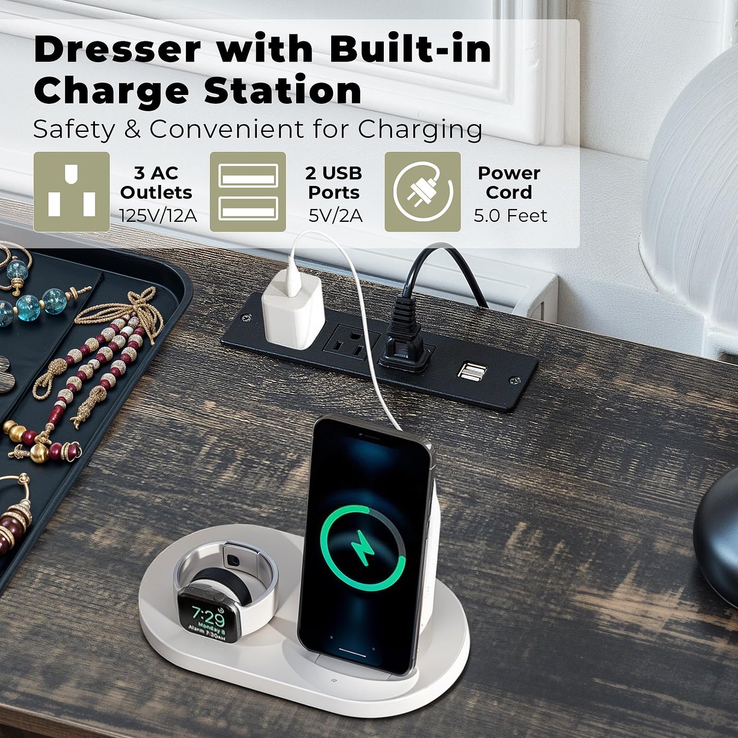 - Farmhouse Drawers Dresser With Power Outlet: The top of the chest of drawers with large socket, outlets has 2 USB ports and 3 AC outlet deal for charging a variety of devices such as TVs, computer, WiFi routers, small household electric appliance and more