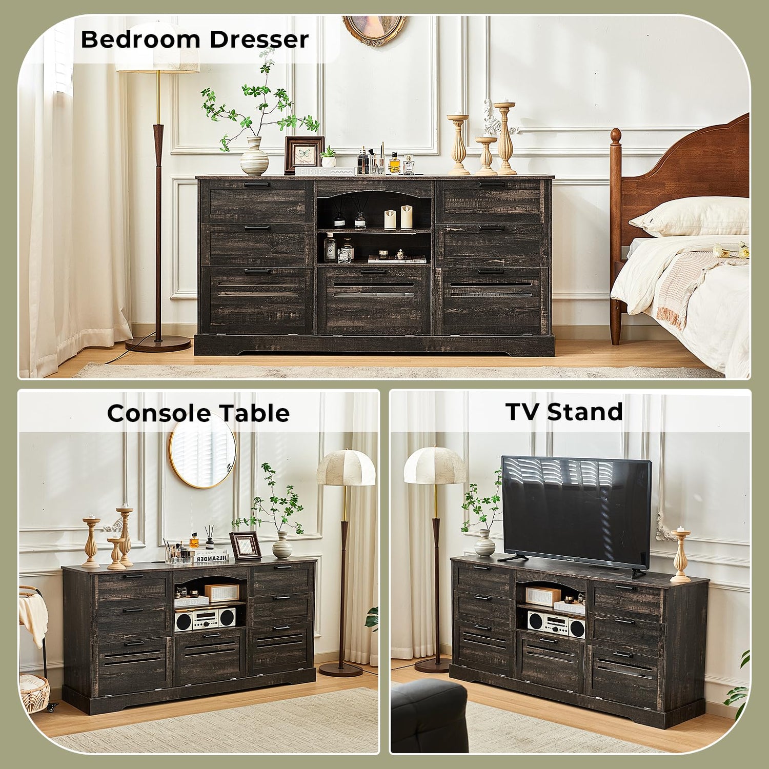 JanflyHome Wood Rustic Chest of Drawers, 63" Wide Vintage 7 Dresser with Outlet and Lights, Farmhouse Drawers Dresser with 4 Drawers & 3 Cabinets for Living Room, Dark Rustic Oak