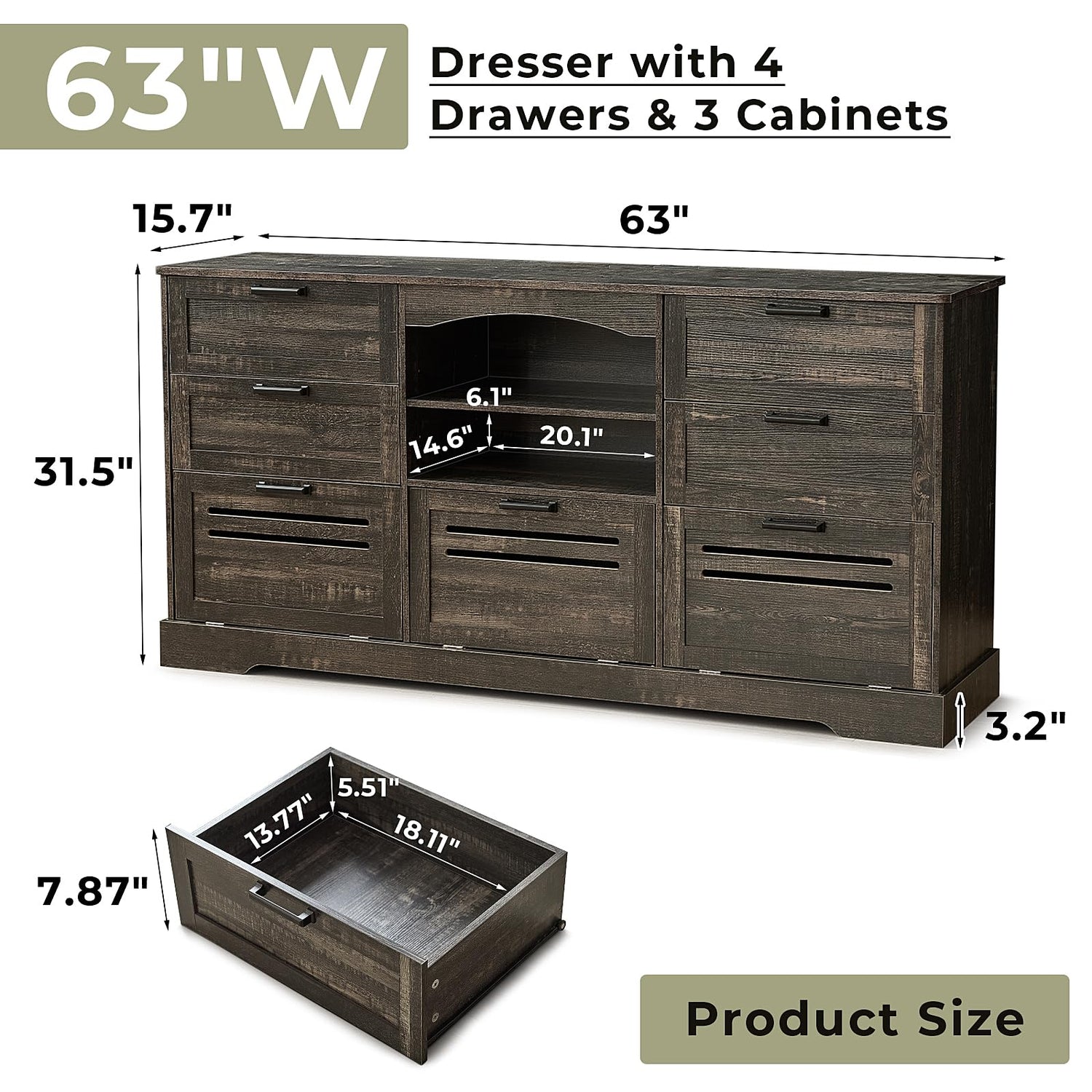 - Ample Storage Space Vintage 7 Dresser: The farmhouse drawers dresser with 4 large drawers, 3 large-capacity storage cabinets and 2 open storage compartments in the center can meet many different needs