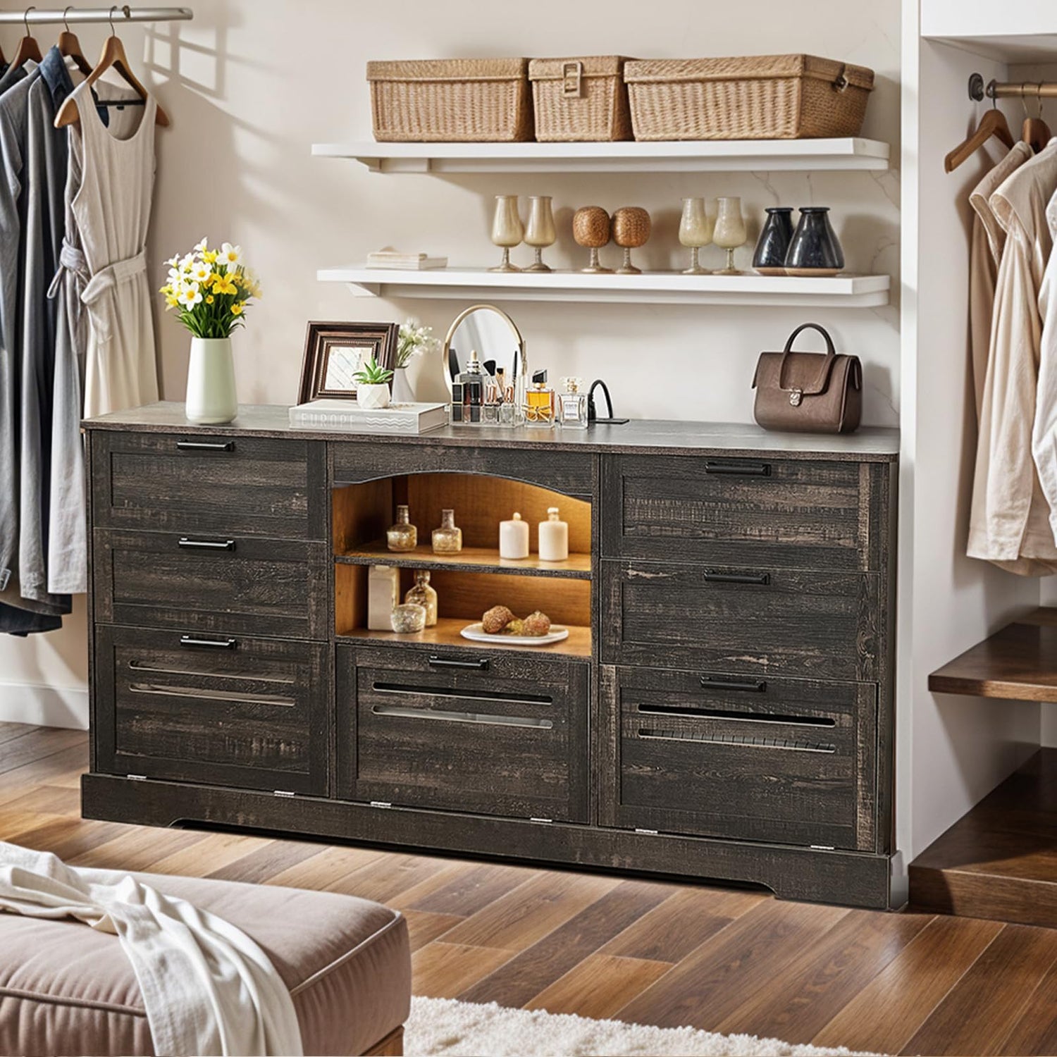 - Rustic Chest of Drawers with LED Light: The long LED dresser middle open storage cabinet is equipped with easy adjustable and removable light strips, monochrome warm yellow light can be adjusted brightness and lighting modes, suitable for a variety of atmospheres, removable and rechargeable, easy to use