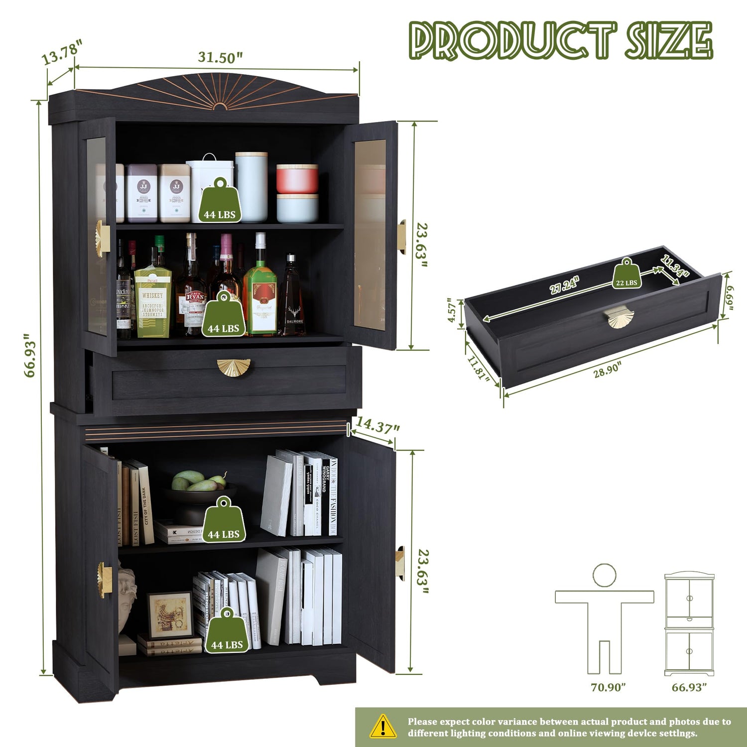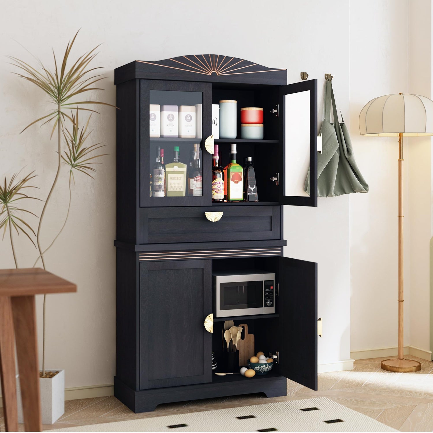 - 【Farmhouse-Inspired Design】Designed in 2 rustic black and walnut colors with gold metal handles and carved rustic lines, this kitchen pantry cabinet adds warm farmhouse charm to any room, whether it's the kitchen, dining room or bathroom