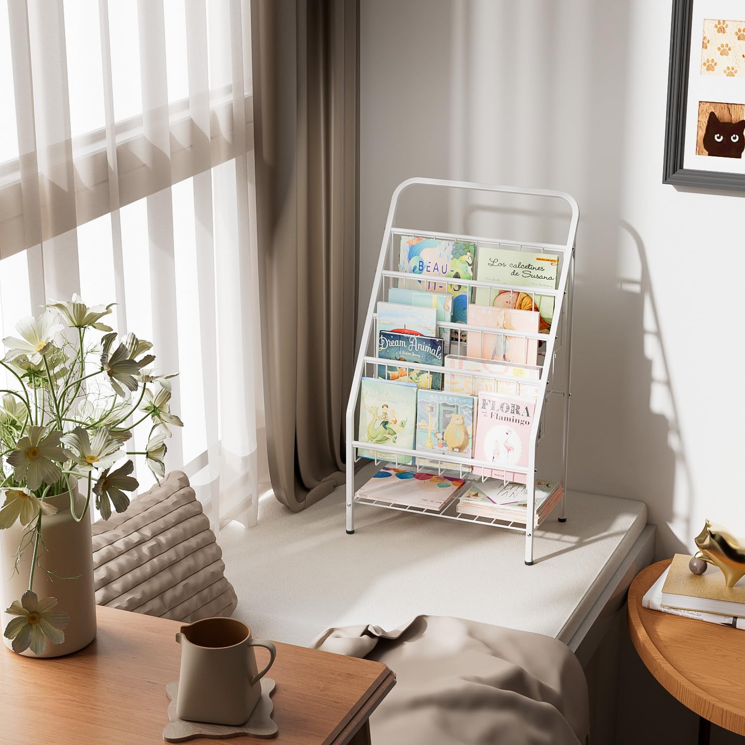 JAQ Kids Bookshelf, 4-Tier Metal Sling Kid Display Bookshelves Bookcase with Toy Storage in Baby Corner Library Room Classroom Playroom for Toddlers Nursery Children (4-tier/28.35inch, White)