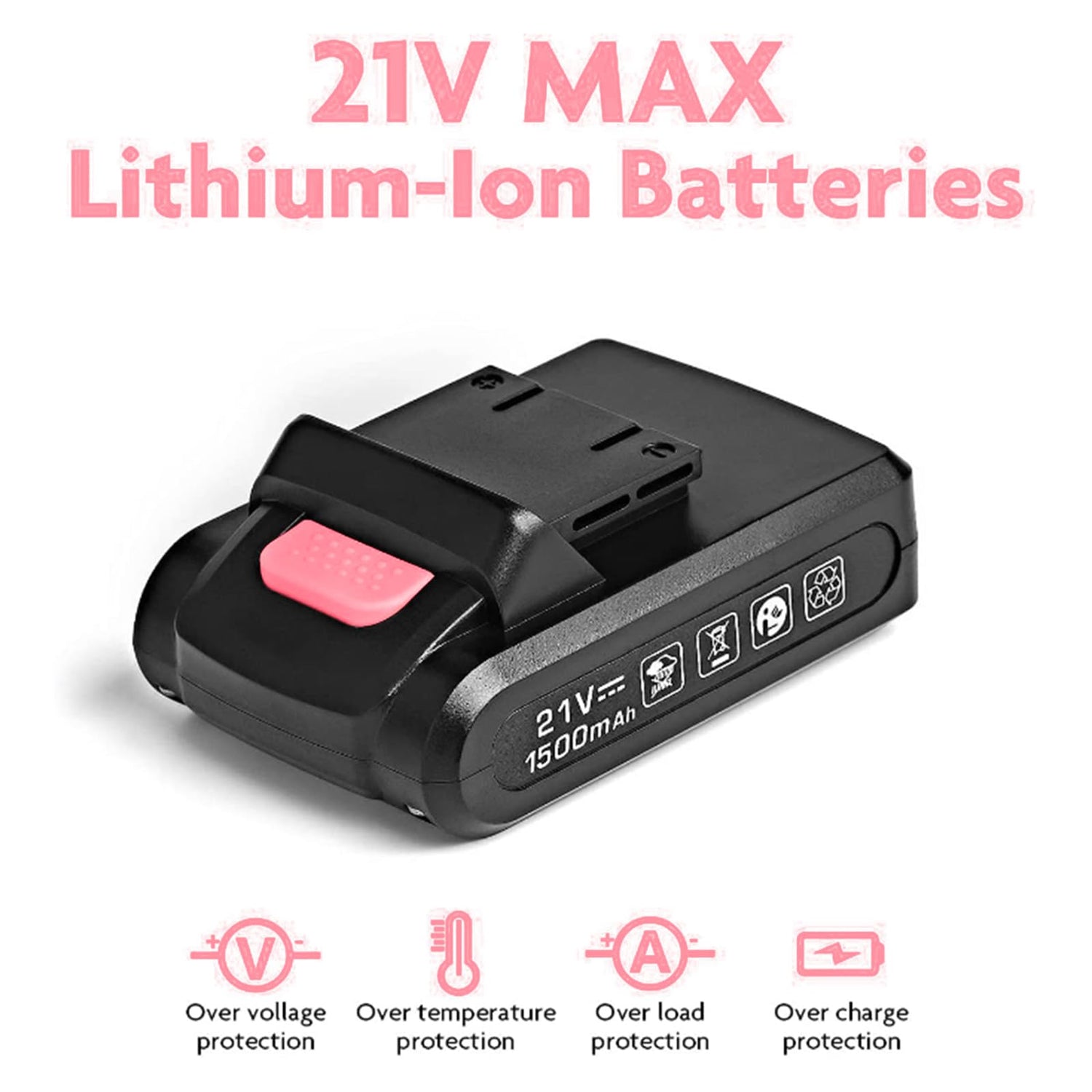 - 21V Power Cordless ElectricDrill with LED - Pink Cordless drill delivers 350 in-lbs (40 N.m) of max torque with 18+1 torque settings for precision: 3/8 "keyless chuck ensures secure bit retention; Features variable 2-speed (0-350/0-1350 RPM) for Home Tool Kit.