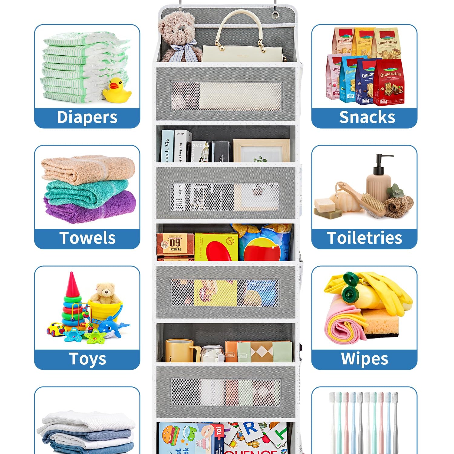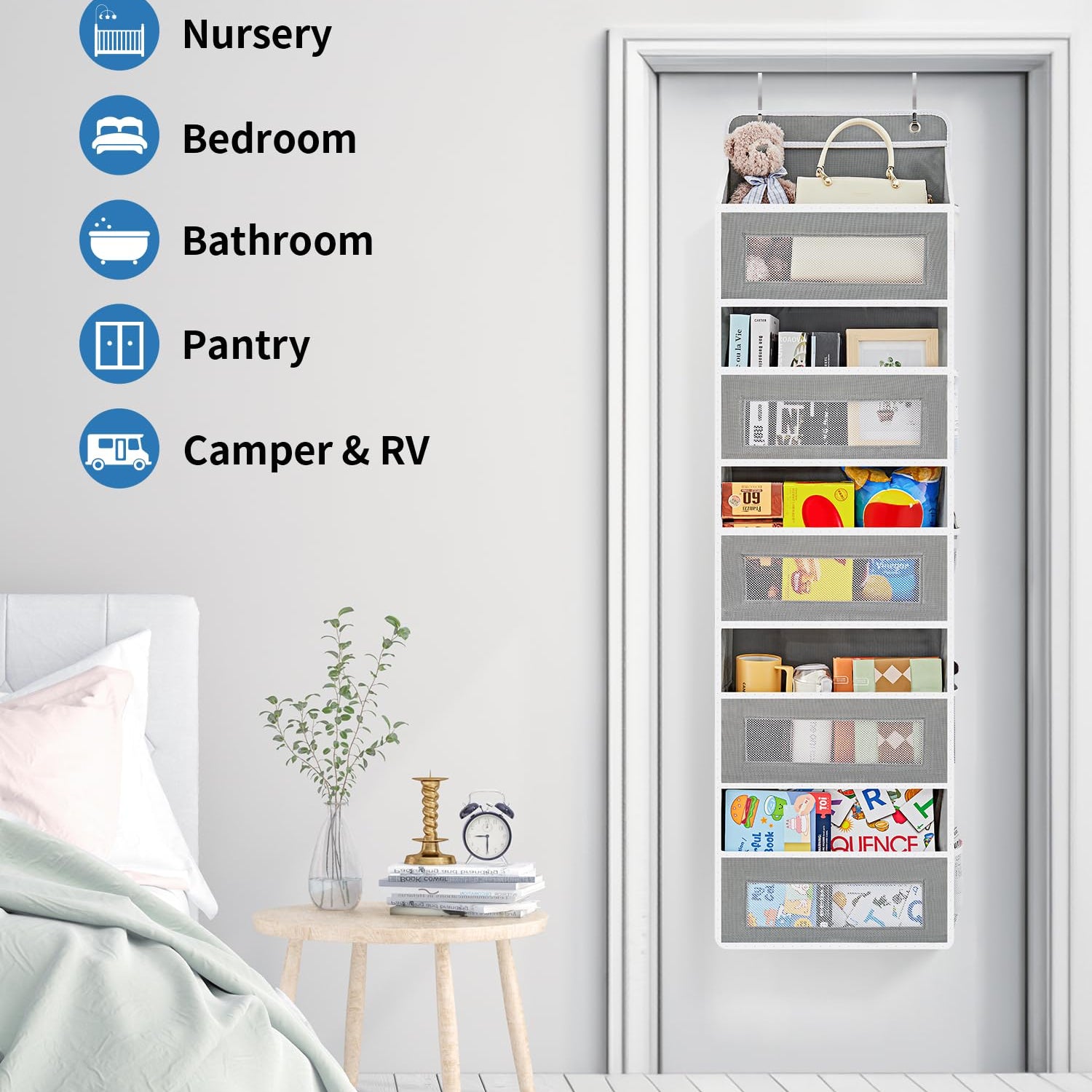 - Multipurpose door storage: Versatile hanging door organizer works great for expanding storage. Fits children's rooms, storage rooms, offices, laundry rooms, bedrooms, bathrooms, living rooms, pantries, dorms, nurseries, and other areas where you need to store toys, diapers, wet wipes, baby towels, socks, and other items. Designed to cater to all your storage needs.