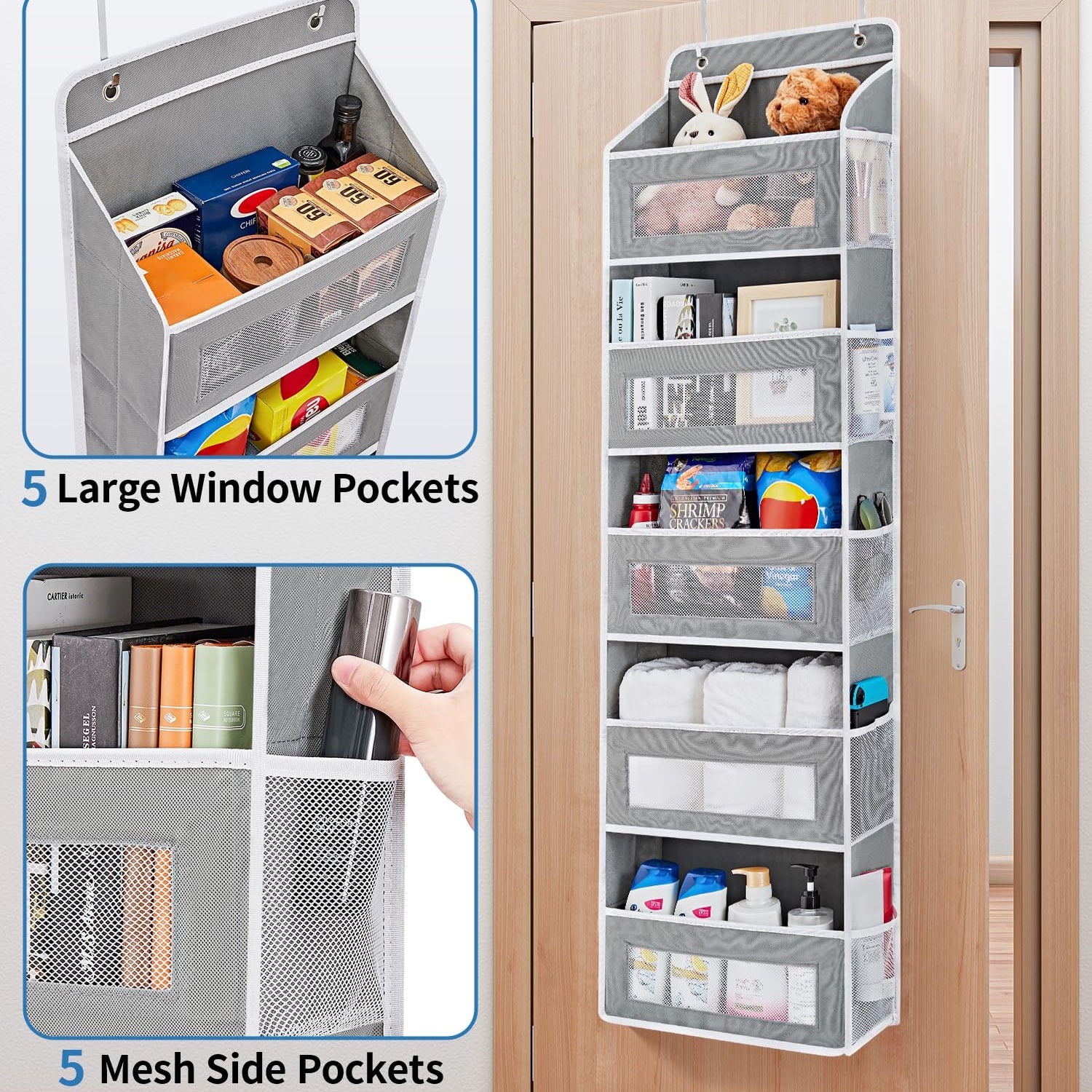 - Double Your Storage Space: Featuring 5 roomy pockets (up to 15.7" /40cm long) and 5 additional mesh side pockets, this Over the Door Organizer Storage instantly expands storage options, making it an ideal space maximizer for any room.