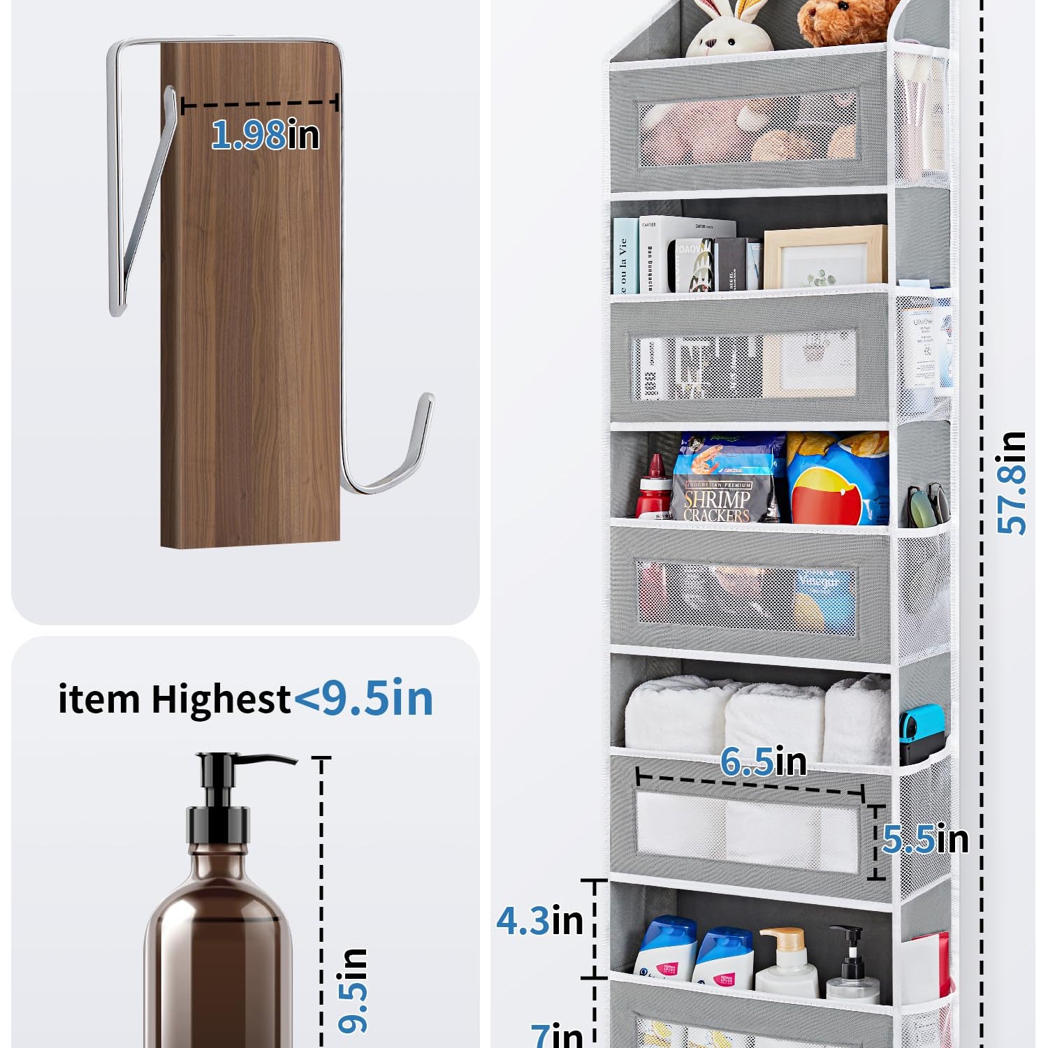 - Easy Accessibility with Bigger Pockets: Sized at 15.7in L x 5.5in W x 57.8 H, our closet door organizers provide larger bins and 4.3" gaps for effortless access. The see-through mesh on each pocket ensures you find what you need effortlessly.