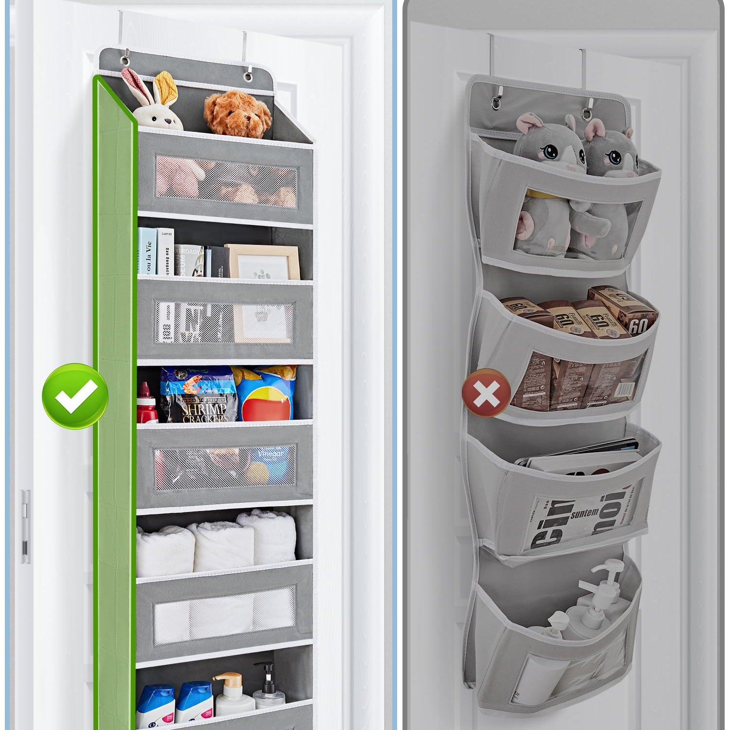 - Swing-proof & 44 LB Load: Unlike other door organizers, our product features reinforced stitching between each side pocket, and built-in strengthened side cardboards to prevent tilting. Additionally, strongly reinforced bottom cardboard, which can stay put without deforming even when you load up to 44 lbs. Also, do not move/sway when you open or close the door.